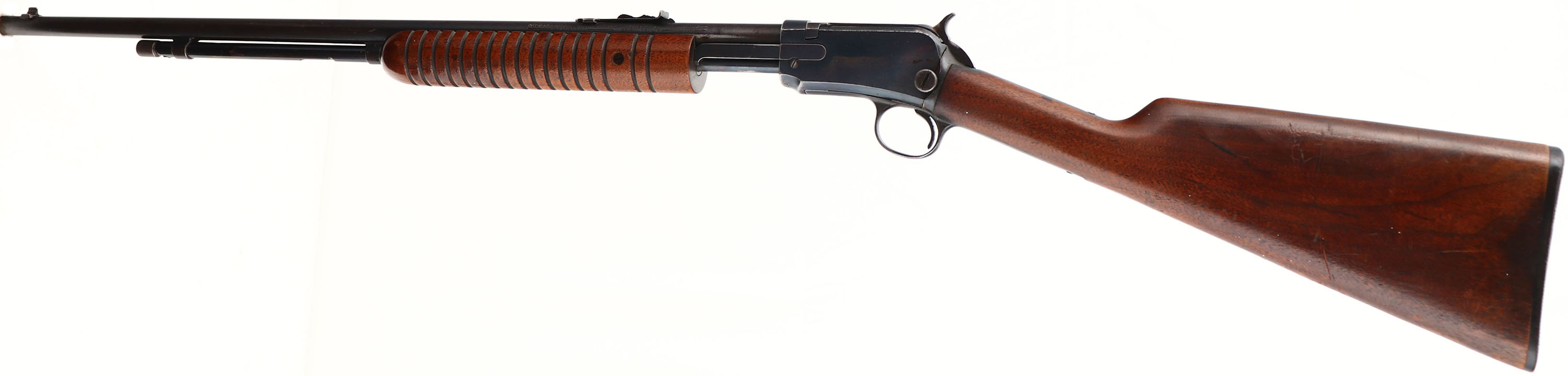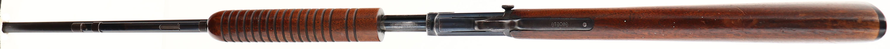 Winchester Model 62A, marked .22 S.L or L.R., MFG.1946, SN:171981, Take-down. Pump Action Rifle, 23'' round barrel. The original factory straight grip wood stocks are excellent, with some minor scratches, handling marks & contusions to the thinning original finish. The original metal blue finish is 80% on receiver & mag, 70% on barrel, starting to gray as it thins on the barrel. Bore is excellent. Barrel is fitted with factory sights. Factory buttplate. An very nice original example. FFL or C&R Req - Value: 500 to 1000