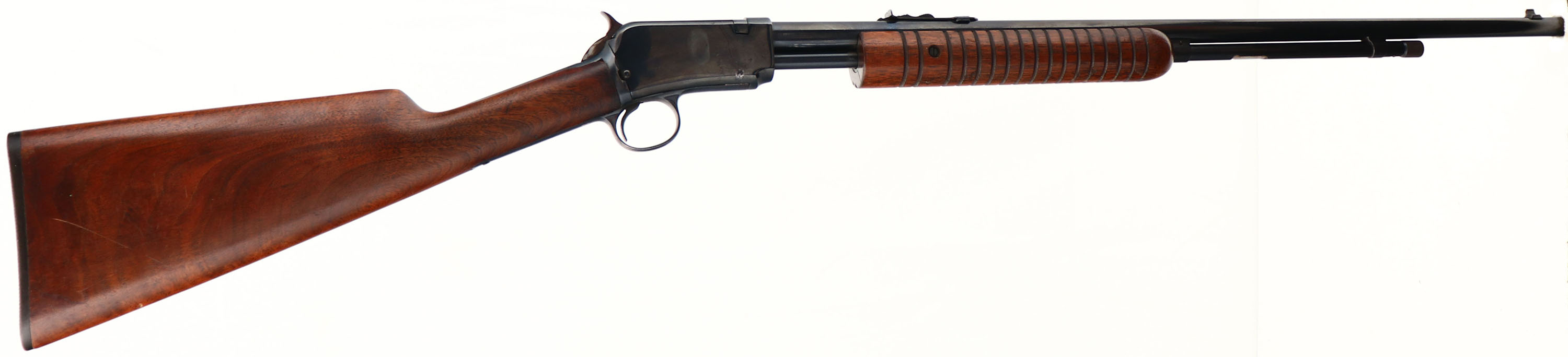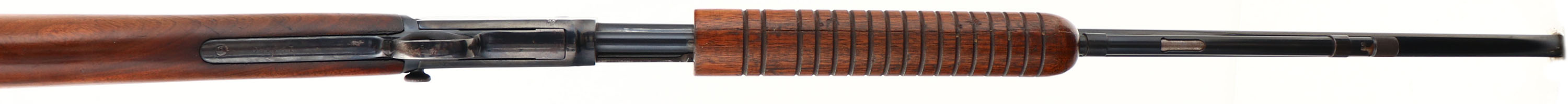Winchester Model 62A, marked .22 S.L or L.R., MFG.1941, SN:124450, Take-down. Pump Action Rifle, 23'' round barrel. The original factory straight grip wood stocks are very good & solid despite a glue repaired stress crack that runs the length of the forend. The stock displays very nice rippled grain, which is well above average, with some minor scratches, handling marks & contusions to the original finish. The restored metal blue finish rates 80% on receiver, 90% on barrel & mag. Bore is excellent. Barrel is fitted with factory sights. Factory buttplate. WARNING, the hammer on the rifle does not stay back when pumped & therefore slam fires. The rifle may have been misassembled when reblued or may be missing a part. Therefore, this gun is being sold ''AS-IS'' as a parts rifle, with no returns, & should not be loaded or attempted to fire before being worked on by a professional gunsmith. FFL or C&R Req - Value: 200 to 400