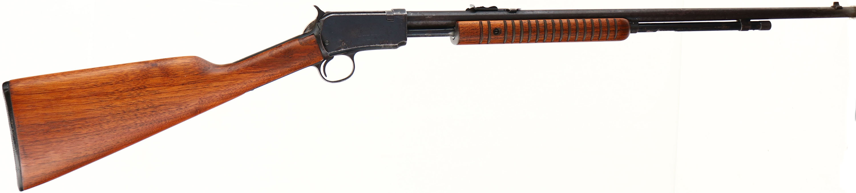 Winchester Model 62A, marked .22 S.L or L.R., MFG.1950, SN: 282119, Take-down. Pump Action Rifle, 23'' round barrel. The original factory straight grip wood stocks are very good, having been stripped, lightly sanded & reoiled. There are virtually no remaining handling marks. The original metal blue finish is 70% on receiver & mag, with 50% coverage of remaining finish toning to a brown patina on barrel. There are areas of light pitting on the metal surfaces. Bore is good & clean, but with areas of scarring. Barrel is fitted with factory sights. Factory buttplate. A solid old pump Winchester. FFL or C&R Req - Value: 350 to 700