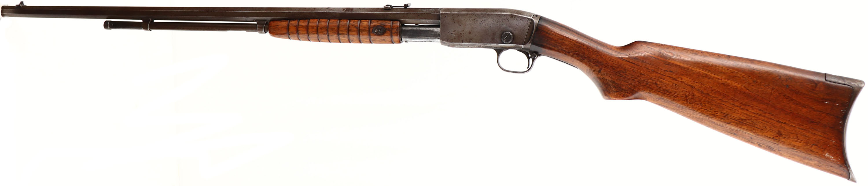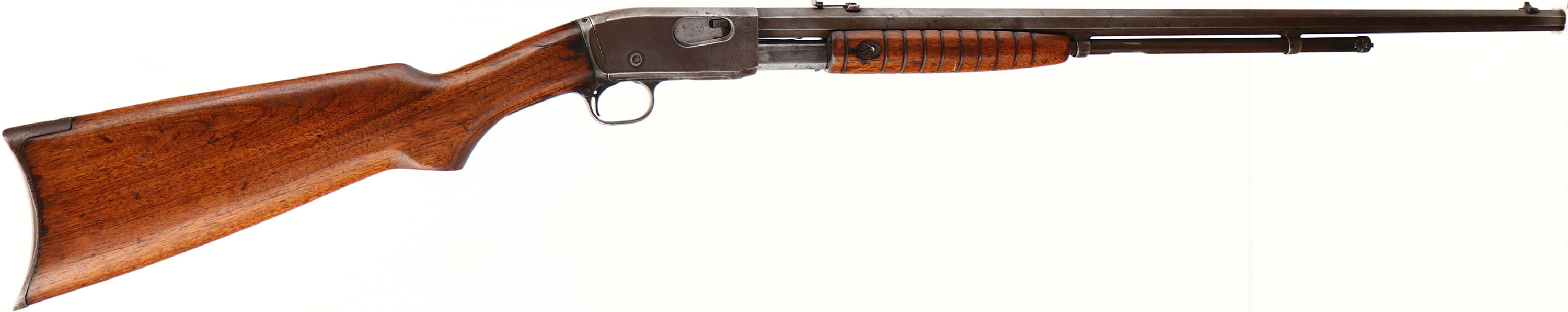 Remington, Model 12C, .22 S. L. & LR., MFG. 1909-36, SN:137382, Pump Rifle, Take-down, 24'' Octagon barrel. The original flat pistol grip wood stocks are good, having been sanded & refinished. There is a filled hole at the top of the wrist from the previous mounting of a Marbles tang sight, as well as some oil staining & minor handling marks or contusions. The metal finish has worn mostly gun metal gray, with a thin brown patina developing. Fitted with standard front & rear sights. Bore is very good, with some light roughness. Original crescent metal buttplate. FFL or C&R Req. - Value: 250 to 500