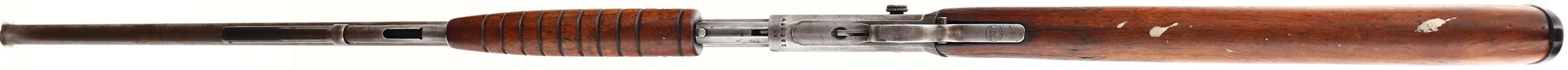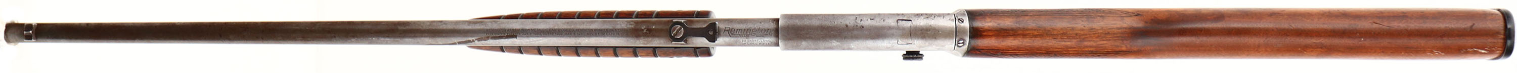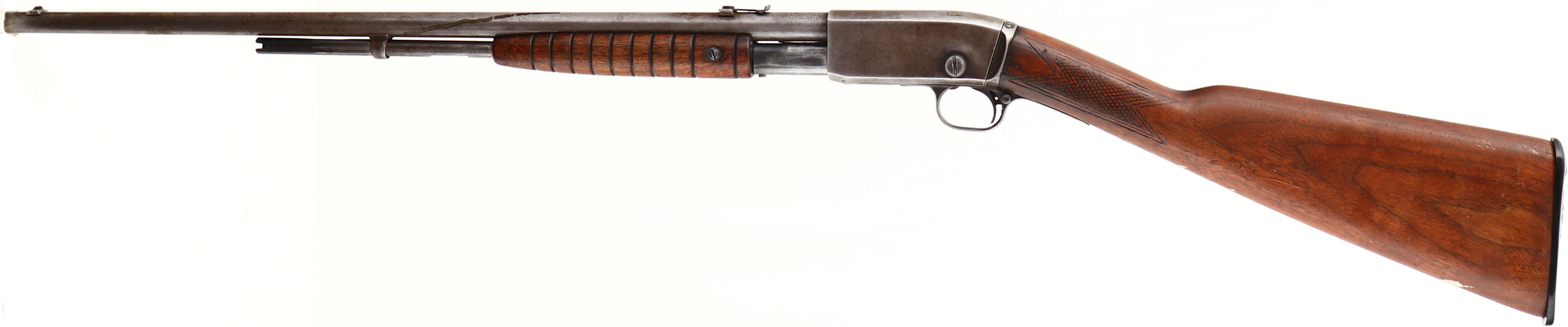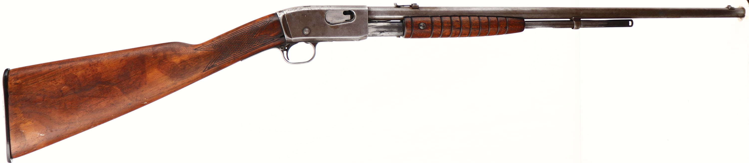 Remington, Model 12A, .22 S.L. & LR, MFG. 1909-36, SN:158387, Pump Rifle, Take-down, 22'' round barrel. The straight grip wood stocks are fair & solid, having been sanded below the metal & refinished. The stock has amateur checkering & 3 stress cracks at the wrist of the stock. There are other minor handling marks & some paint spots to the finish. The original metal blue finish has worn mostly gray, with a thin brown patina. Fitted with standard rear & front sights. Bore is fair. Replaced reproduction plastic buttplate, which is oversized to the wood. The bolt & sliding mechanism do slide back & forth, but the rifle appears to be missing some internal parts which likely restrict it from functioning properly. It is also missing the mag plunger. We are not gunsmiths, but we recommend this rifle be examined & repaired by a gunsmith before attempting to operate. Thus this rifle is being sold as a parts rifle & is therefore being sold ''AS-IS'', with NO RETURNS. FFL or C&R Req. - Value: 100 to 200