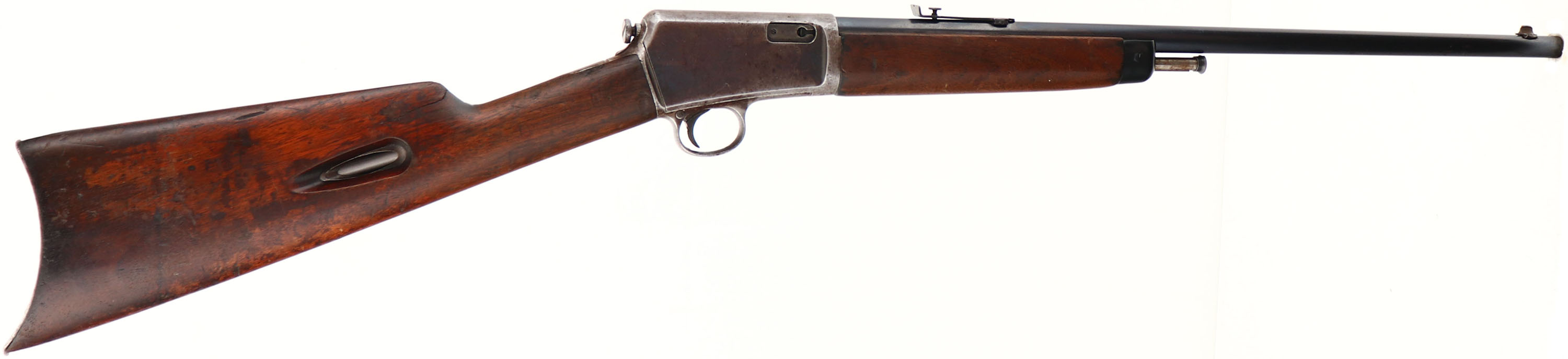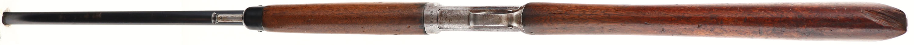 Winchester Model 1903, CAL: .22 WIN Automatic, MFG:1906, SN: 29108, Semi-Auto Rifle, 20'' Tapered round barrel. The original straight grip wood stocks are fair, with several horizontal stress cracks located at the wrist & another 5.5'' tight stress crack on the left side of the forend. The toe & upper comb of stock by the buttplate have wood chips & there is a gouge & crack at the front of the upper comb. The original finish shows lots of wear, thinning & oil staining. The metal blue finish on the barrel rates 90%, while the receiver has worn mostly gun metal gray, with a thin spotty brown patina. Forend cap appears to be reblued. Bore is excellent. The rifle is fitted with updated rear & front sights. Crescent metal buttplate. FFL or C&R Req. - Value: 150 to 300