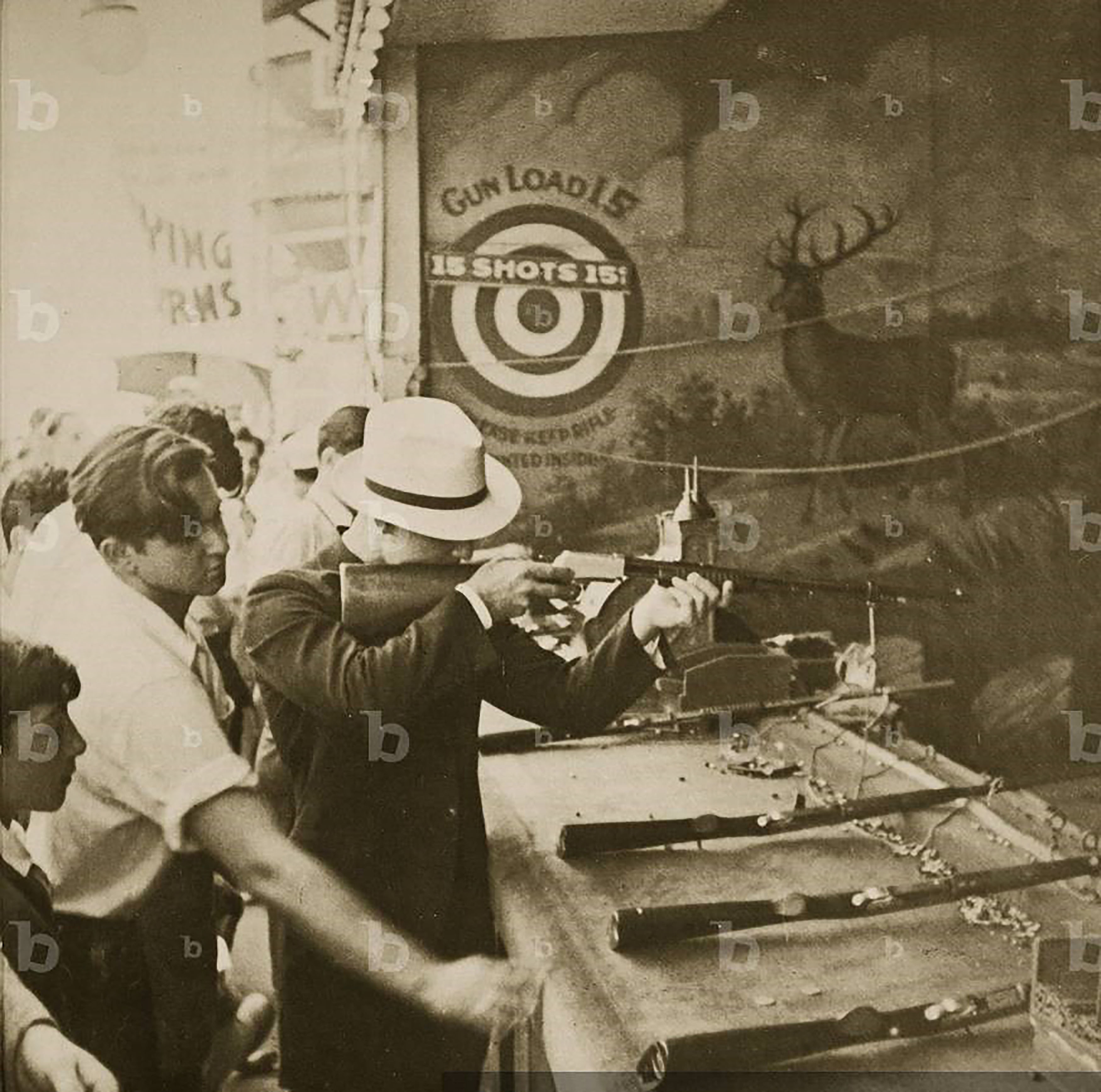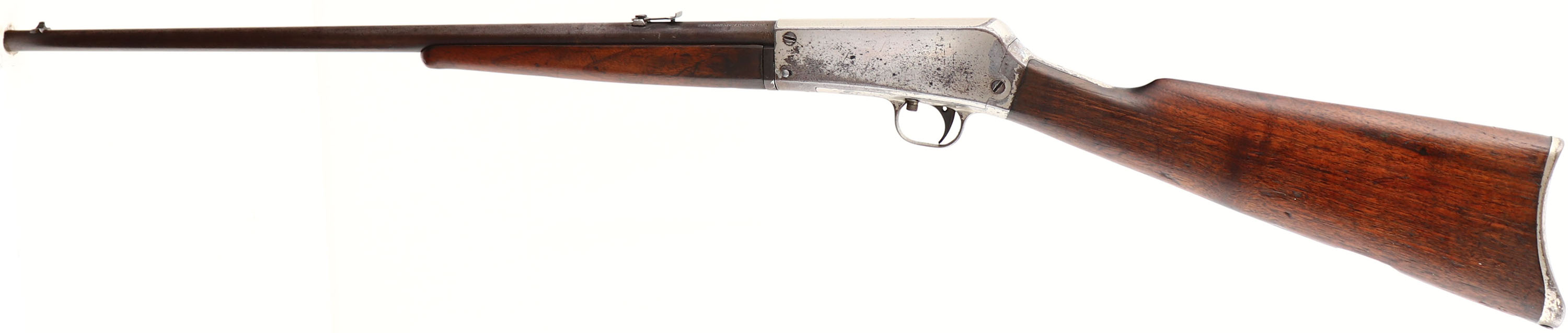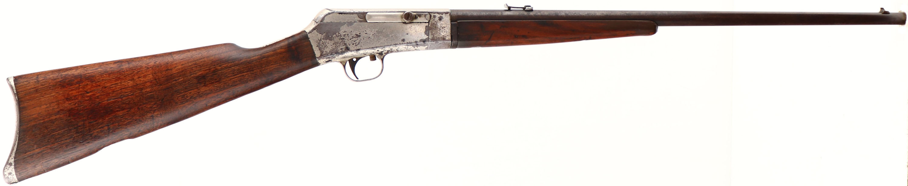 EXTREMELY RARE Remington, Model 16 HALF NICKLE Gallery gun, Marked .22 REMINGTON AUTO Cal., MFG: 1916-28, SN:9205, Semi-Auto Take-down Rifle, 22'' Tapered round barrel. Remington's first production semi-auto .22 rifle. Just 17,720 were manufactured during the 13 yrs of production. According to the consignor, this rare half nickeled model 16 was won by his grandfather by outshooting the owner of the Coney Island NY shooting gallery, some time in the late 1910's or early 20's. His grandfather had served as a sniper during WWI & was known to be quite a marksman. He challenged the gallery owner to a bet/shooting contest & came home with this rifle as his victory trophy. The rifle was greatly passed by his grandfather who used regularly throughout his life until passed onto his son & then to him upon his father's death. Although not a typical model or round for a gallery rifle, it makes sense that this rare half nickeled rifle was in a NY shooting gallery due to its proximity to Remington's Ilion NY production plant. Remington worked hard to get their rifles into these early shooting galleries to get the public used to shooting a Remington over their competitors' rifles. They often placed in these galleries nickeled or rifles with other attractive features to catch the public's eye. Sometimes these special rifles were displayed as a premium prize offering, the type that hung on the wall & for the most part, odds of winning them far exceeded the likelihood & skill of most patrons. While the story of winning it at the gallery is likely creditable, unfortunately there is no record or proof of prominence to substantiate. The original factory wood is very good & solid, but with numerous minor scratches, scrapes & contusions to the worn thin original finish. Some darkening of the wood in areas due to oils & use. The schnabel tip of the forend shows evidence of stress crack repair. The original nickeled finish is retained at 70% on the receiver, 25% on the buttplate, with areas of flaking & wear toning to a brown patina. The metal blue finish on the barrel has fully toned to a chocolate brown patina. Bore is very good, clean, but with spots of scarring amongst solid rifling. The barrel carries the original elevation adjusting rear sight & small blade front sight. Original metal buttplate. Ammo loads through the buttplate into the loading tube in the stock. The .22 Remington Auto round fires a 45 grain bullet approximately 950 feet per second, with 90 ft. lbs of muzzle energy. Due to the larger diameter of the case, the cartridge is not interchangeable with the .22 Short, Long or Long Rifle. The reason for the unique cartridge was to prevent use of black powder .22 S, L, & LR cartridges from being fired in this gun, which was previously the standard at the time. Black powder doesn't work well in semi-auto guns, another reason the semi-autos arrived on the scene around the time of the adoption of smokeless powder. An interesting & rare semi-auto rifle & an early ancestor to Remington's semi auto .22 offerings. B&W picture of shooting gallery does not come with the auction & is used only for descriptive image purposes. FFL or C&R Req - Value: 1000 to 2000