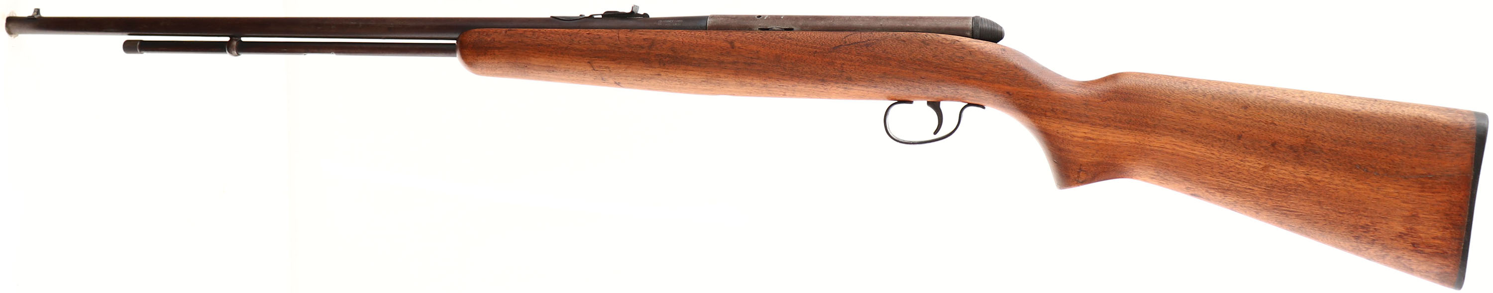 Remington Model 550-1, 22 SHORT, LONG or LONG RIFLE, MFG: 1950's, SN: NONE, Blowback Semi-Auto Rifle, 24'' round tapered barrel. Similar to the model 550 except with a single extractor rather than double extractor. The original flat pistol grip stock is very good, having the original finish stripped & reoiled, with multiple minor scrapes, scratches & contusions. The original metal blue finish has worn to a thinned brown patina & with some spots of corrosion. Standard rear & front sights. Bore is good & bright. The stock carries an original buttplate. FFL or C&R Req. - Value: 150 to 300