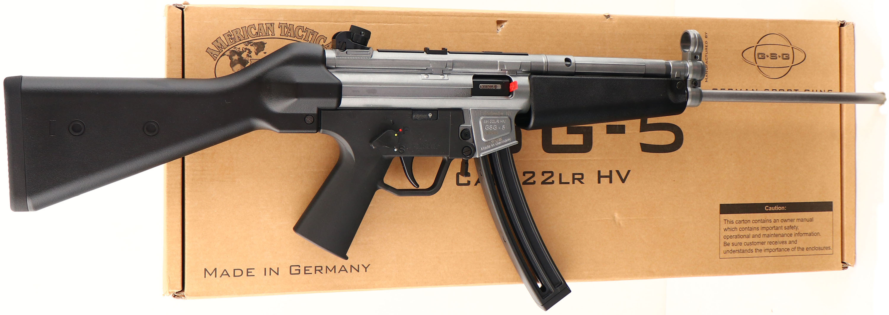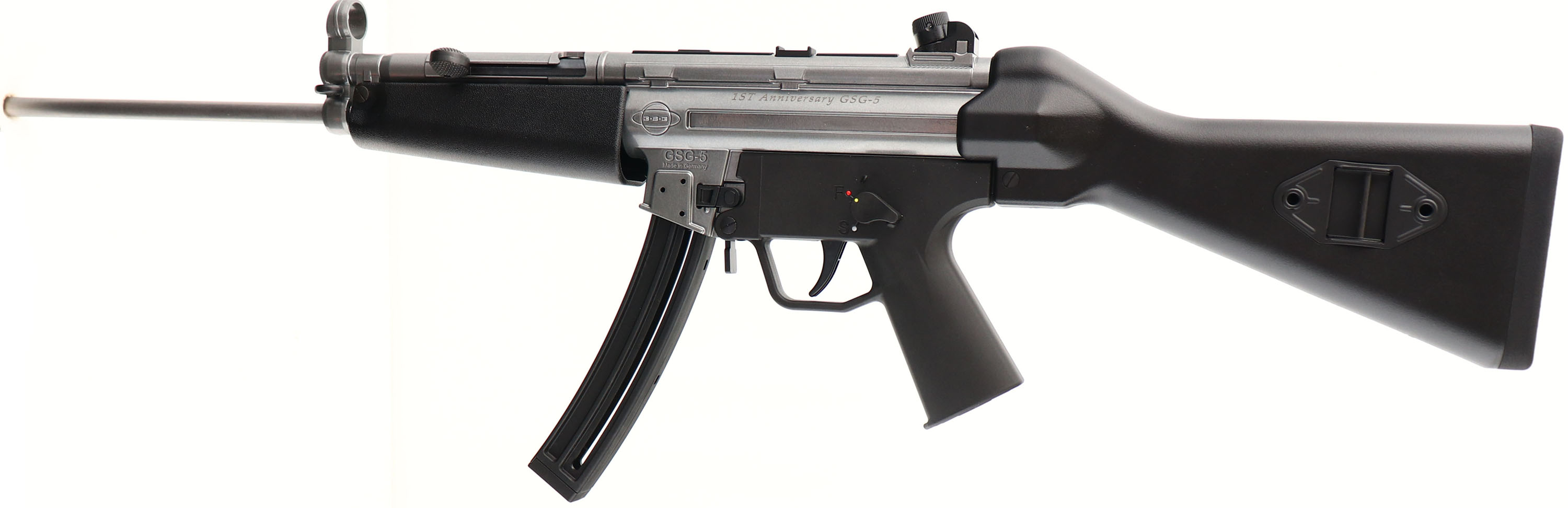 BOXED, GSG, Model GSG-5 1st Anniversary, CAL: 22LR, MFG: Modern, SN: A308395, Semi Auto Rifle, 16'' barrel. The synthetic stock, grip & forend are mint. The matte gray finish on the receiver rates 99%+ overall. Bore is mint. Factory sights. This example is missing the imitation suppressor. This rifle externally resembles the Heckler & Koch MP5 style submachine gun. Comes in factory box, with related paperwork, trigger guard lock, tool, extra parts & magazine. FFL Req. - Value: 300 to 600