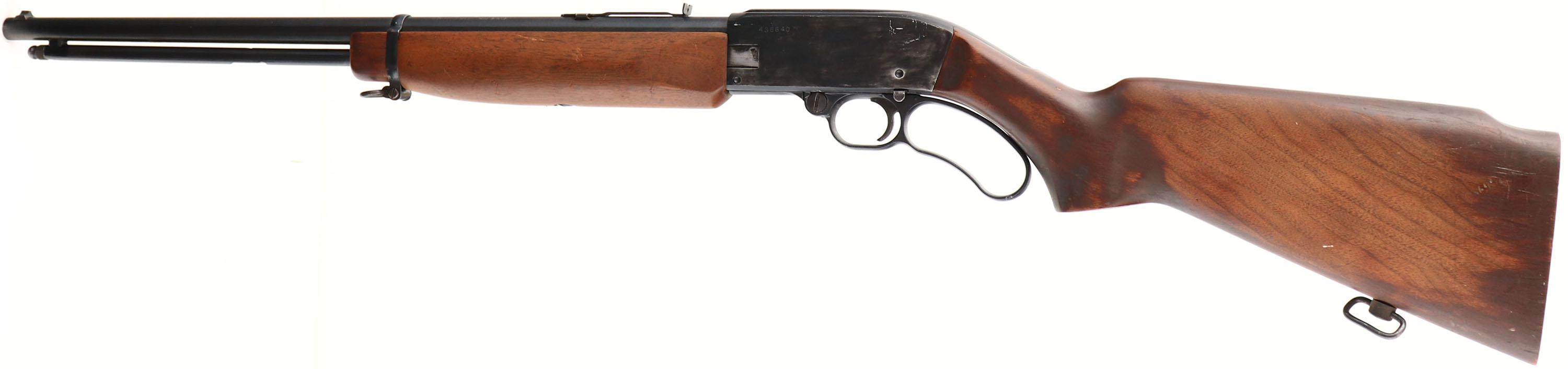 Western Field, Model M865A Carbine (Mossberg 402), marked .22 S.L.LR. Cal., MFG: 1961-71, SN: 436640, Lever Action Carbine, 20 1/4'' Round barrel, Full mag., The original wood stocks are good & solid, but someone has started a sand & refinish project on the stock that was never completed. There are a few small scratches, scrapes & contusions remaining. There is a 2'' stress crack emanating from the upper tang & running to the comb. The original factory blue finish on the barrel & mag rates 80%, but with rust speckling. The Japan black finish on the receiver rates 70%, with most of the loss on the left side from someone scrubbing it off. The barrel carries factory rear & front sights. Bore is very good. The stock is missing the buttplate. Sling loops. An interesting little boys rifle & copy of dad's carbine. FFL & C&R Req. - Value: 100 to 200