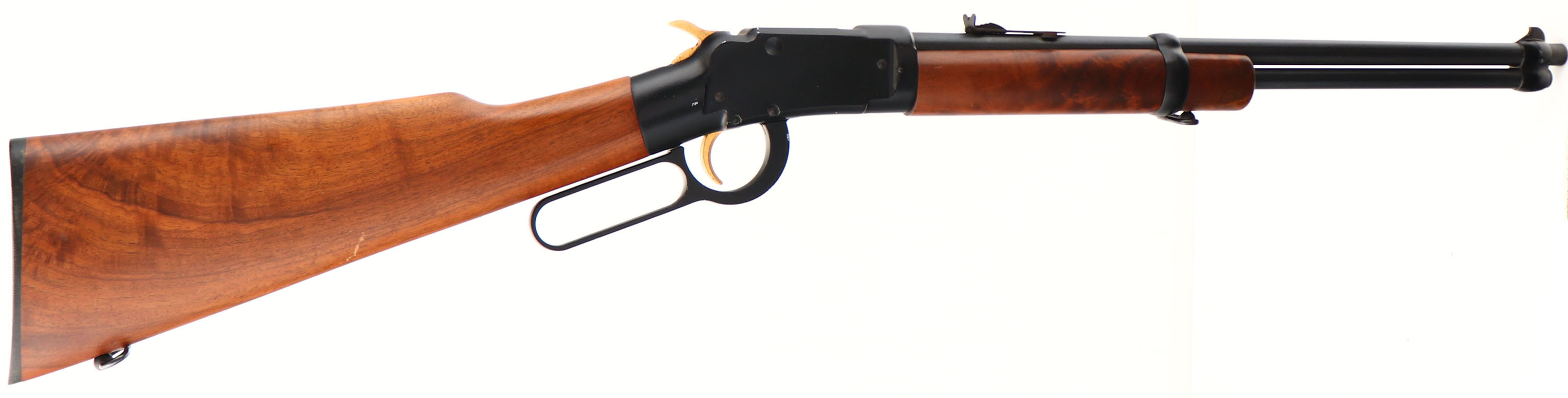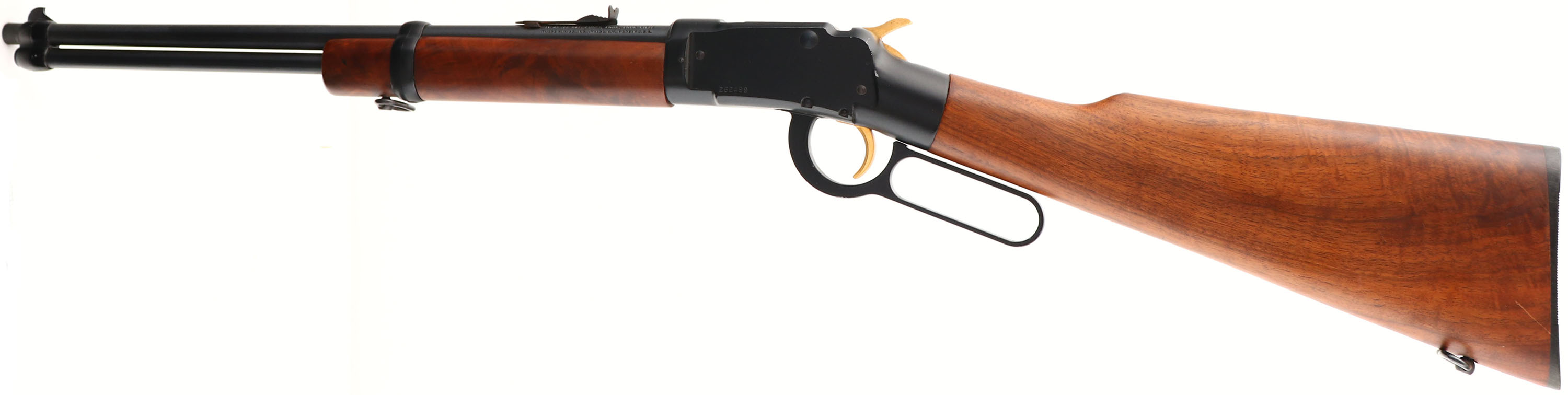 Ithaca, Model M-49, CAL: .22 S.L.LR., MFG: 1961-78, SN: 262499, Lever action single shot rifle, Martini-style drop block action, 18'' barrel. Full mag. The original straight grip stocks are excellent, with just a couple of scrapes to the original finish. The original metal blue finishes on barrel & false mag tube rate 98%, with the barrel graying. The Japan black receiver also rates 98%. Bore is excellent. The barrel holds a standard adjustable rear sight & tall blade front sight. Stock carries a plastic buttplate. Sling loops. Gold tone trigger & hammer. FFL or C&R Req. - Value: 150 to 300