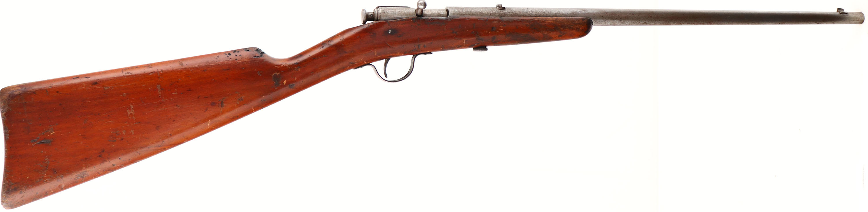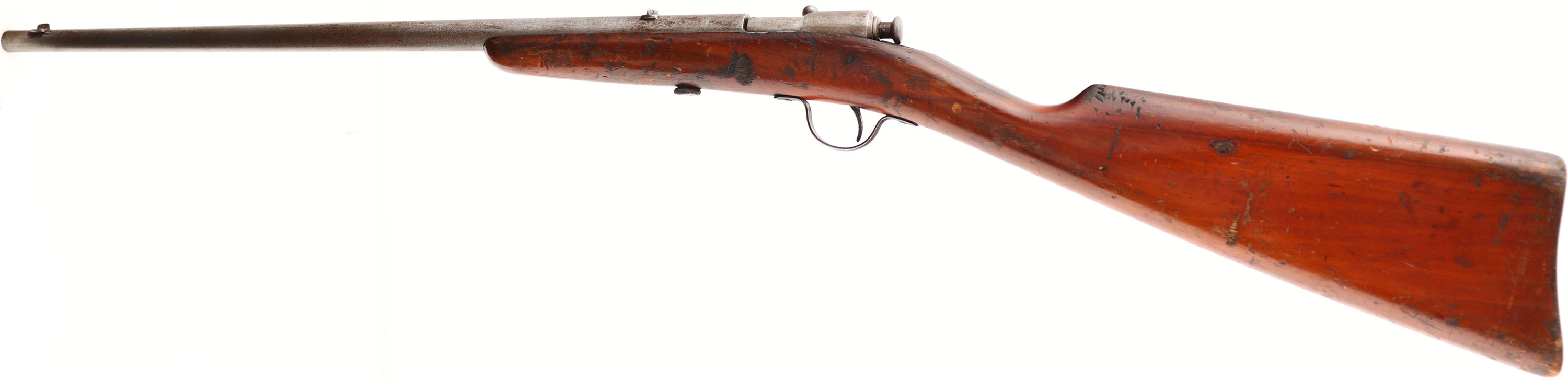 Winchester, Model 1900, CAL: .22 SHORT& LONG, MFG: 1900, SN: NONE, Bolt Action Rifle, 18'' Round tapered barrel. This is the early variation without the model # stamped on barrel. The original wood stock is good, with numerous small contusions, gouges & scrapes to the original finish. The metal finish has worn or been polished to a gun metal gray. The bore is poor due to large spots of rust pitting & corrosion amongst heavily worn rifling. Barrel carries a small fixed rear & small blade front sights. Buttstock carries no buttplate, which is correct for this model. Collectible early production variation. FFL or C&R Req. - Value: 200 to 400