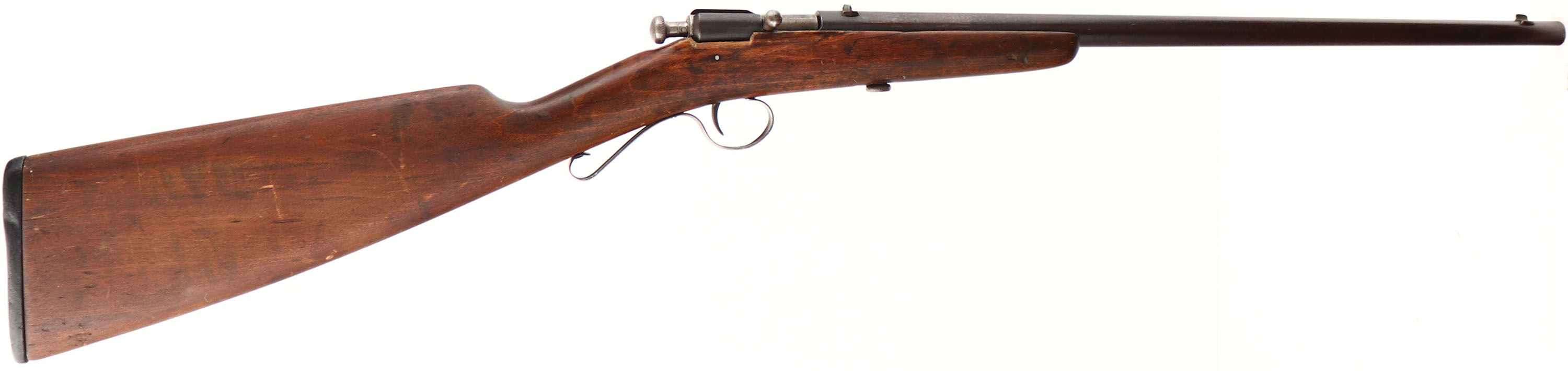Winchester, Model 1902, CAL: 22 Short, Long & Ex Long, MFG: 1902-31, SN: NSN, Bolt Action Rifle, 18'' barrel. The original straight grip wood stock is very good, but does have an edge repair on both sides of the stock along the receiver. The right side has a 1 1/2'' missing chunk still. There are also minor contusions, scrapes & dings to the original finish. The metal finish has worn to a plum/brown patina, with spotting & speckling. Bore is fair, with roughness & pitting amongst some visible rifling. The barrel holds a factory rear & small blade front sights. Stock carries the original worn hard rubber buttplate, with engraved screws. ''S'' shaped trigger guard. FFL or C&R Req. - Value: 100 to 300