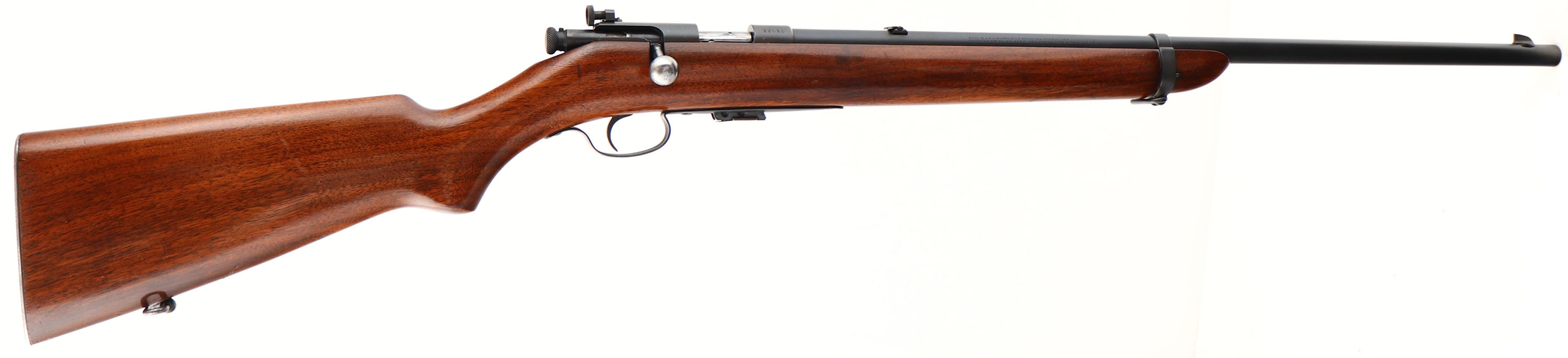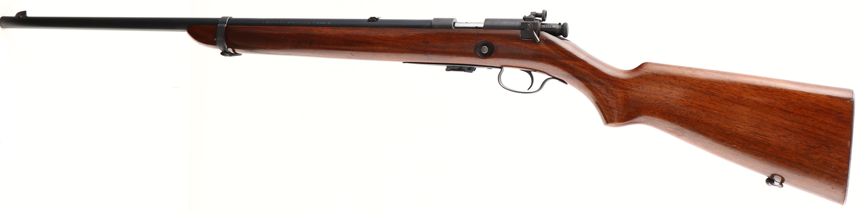 Winchester, Model 57 Target, .22 LONG R. Cal., MFG: 1927-37, SN: 22015, Bolt Action Rifle, Mag fed, 22'' barrel, with barrel band. The original flat pistol grip wood stock is excellent & solid, with minor handling marks & scuffs to the original finish. The metal was professionally refinished rating 98%. Bore is excellent. Military style target rifle, with correct Lyman peep sight, sling swivels, & ''Winchester'' stamped mag. Barrel fitted with folding leaf rear & blade front sights. Stock carries a checkered steel buttplate. FFL or C&R Req - Value: 500 to 1000
