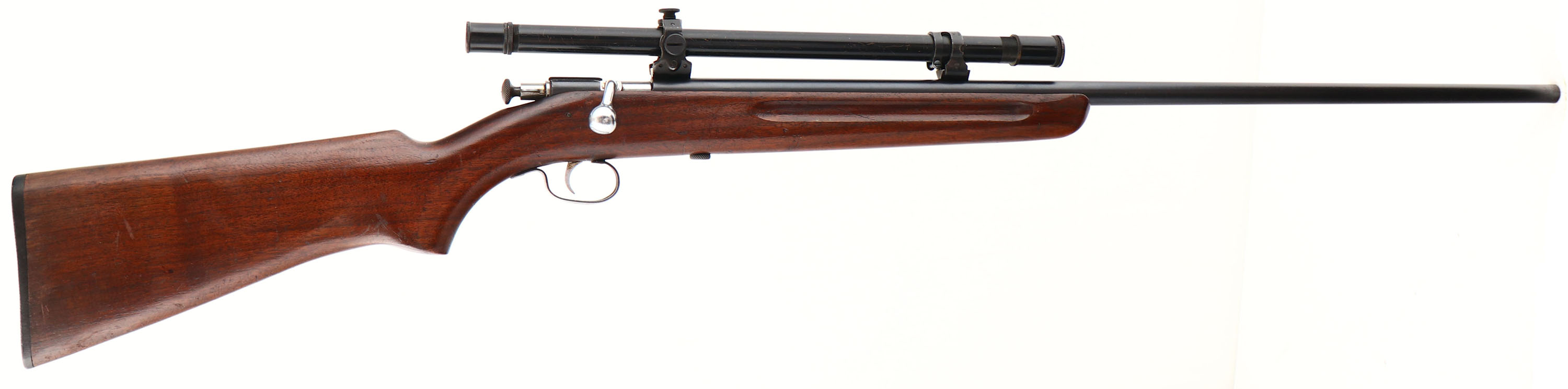 VERY RARE Winchester, Model 677 (Scoped Rifle), .22 W.R.F. Cal., MFG. 1937-39, SN: None, Bolt Action Rifle, 27'' Tapered barrel. Although the barrel is marked ''67'' it is a rare model 677 rifle with no factory provisions for open sights. Winchester sold the British Government scoped Models 67, 677, 69 & 697 rifles, to be used as military training rifles. The Model 677 & 697 rifles were in .22 S.L.or LR. Or WRF Cal., with scopes & no provisions for open sights. The Model 67 & 69 stamped rifles were in .22 S.L.LR. Cal. & fitted with the same scopes, but also with open sights. This is one of the rare Model 677 rifles, without sights & with the proof stamped moved from the top flat to the left side to accommodate the factory mounted scope. This is one that was built for the U.S. market & was not sent over to the British Government. The original pistol grip & early rare finger grooved forend wood stock is excellent & solid. It displays the majority of the original finish, with finish level minor scratches, scuffs & contusions. The metal blue finish on the barrel & receiver is retained at 98% coverage. Finish on trigger guard has thinned to a thin brown patina. Bore is excellent & bright. Rifle is factory fitted with a Winchester scope on Winchester scope rings & blocks. The scope does have minor finish scratches on the tube. Again, the barrel has no sight provisions, which is factory for this model 677. Nickel bolt handle & trigger. The ''Winchester'' marked buttplate is also excellent. Only 2,240 produced. A very rare rifle with collectible optics. Highly sought after & collectible! FFL or C&R Req. - Value: 1500 to 2500