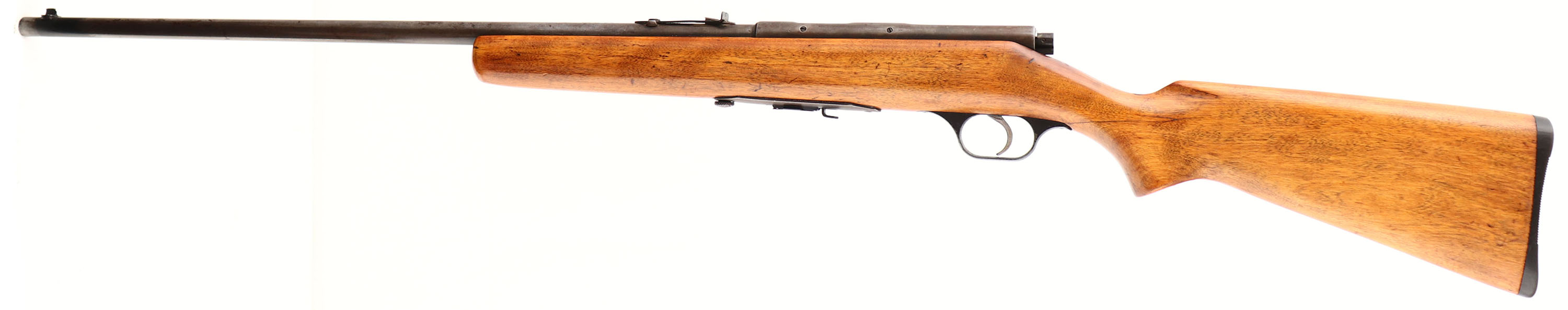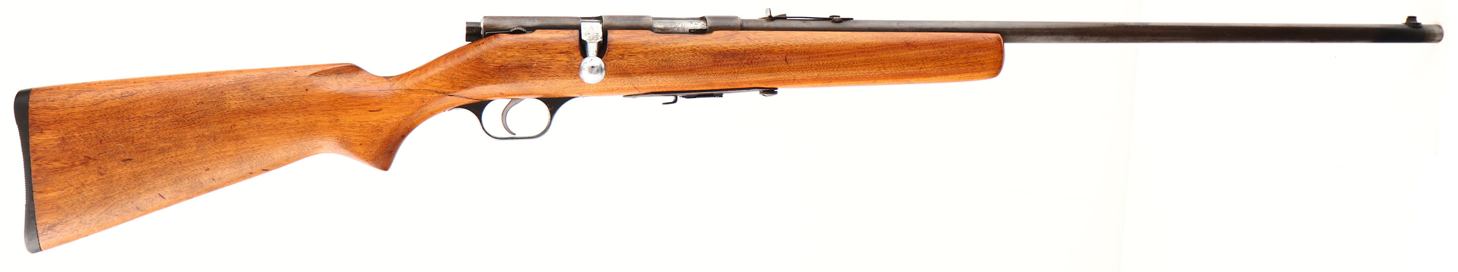 Springfield (J.Stevens Arms Co.), Model: 84C, Cal: .22 S.L.LR, MFG: 1938-60, S/N: None, Bolt action rifle, 24'' barrel. The flat pistol grip wood stock is good & solid, as being sanded & re-finished. Stock had a large crack/break at the wrist that was professionally repaired with a wood dowel reinforcement through the top of the wrist. The repair was very nicely done & is tight & solid. Stock also has some light dings, dents, & scratches remaining. The metal finish has almost completely worn away, with some finish remaining on the stock line & on the barrel by the front sight. The rest of the metal has worn to a gun metal gray & areas are toning to a brown patina. Nickel finish on bolt. The top of the barrel in front of the rear sight, is hand stamped ''SER''. ''SJP''. The bore is very good. The barrel holds a deep V-notch leaf rear & blade front sigh. The stock carries a grooved plastic buttplate. Detachable mag. FFL or C&R Req. - Value: 100 to 200
