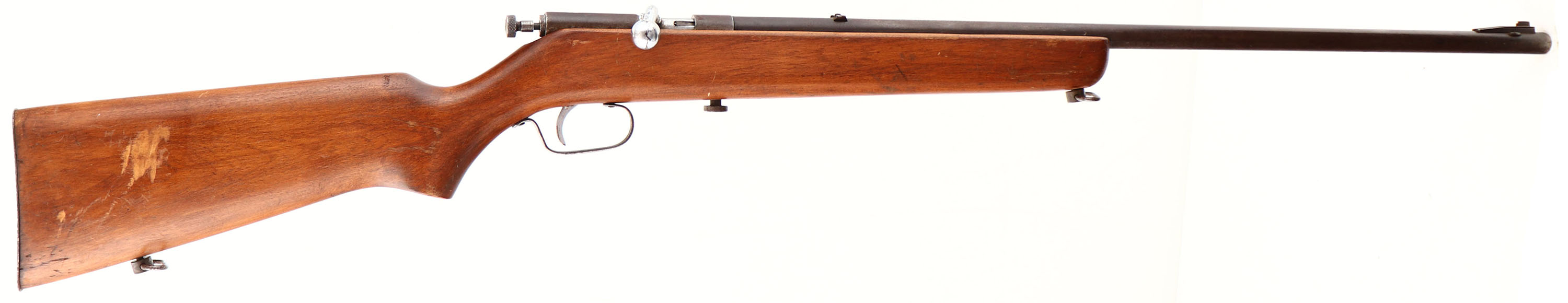 O.F. Mossberg & Sons Inc., Model 25, Cal: .22 S.L.LR, MFG: 1935-36, S/N: None, Bolt action rifle, 24'' barrel. The flat pistol grip wood stock is very good, with scratches, scrapes, dings & wear to a previous sanding & refinish. The flat metal buttplate is slightly proud to the wood at the toe & the heel. The metal surfaces have mostly toned to a brown patina. The bore is excellent. The barrel holds a blade front sight, with no rear sight. The stock carries a steel buttplate. Sling swivels. FFL or C&R Req. - Value: 100 to 200