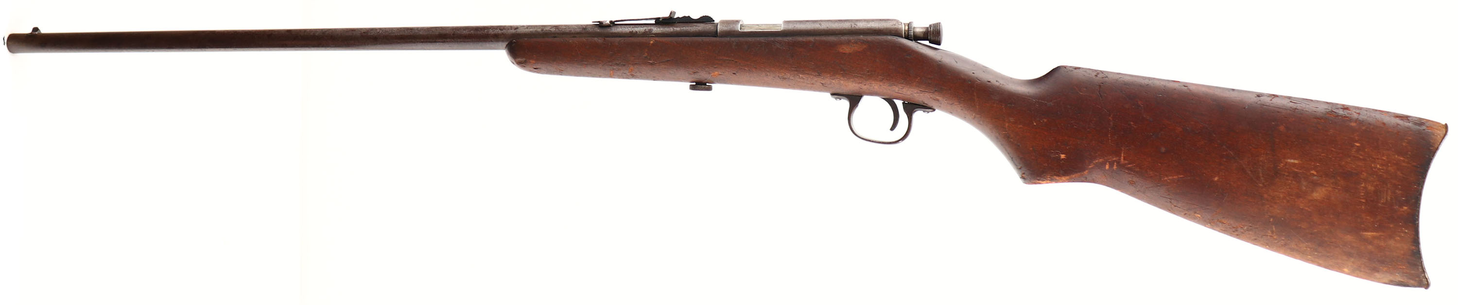 O.F. Mossberg & Sons Inc., Model B, Cal: .22 S.L.LR, MFG: 1940's, S/N: None, Bolt action rifle, 22'' barrel. The semi-pistol grip & perch belly wood stock is fair & solid, with numerous scratches, scuffs, dings & wear from heavy use. The metal has mostly toned to a brown patina, with spots worn gun metal gray. The bore is excellent, clean & bright. The barrel holds an adjustable rear & blade front sights. The stock carries a smooth steel buttplate. FFL or C&R Req. - Value: 100 to 200