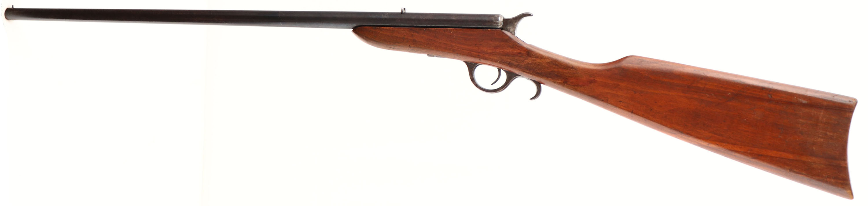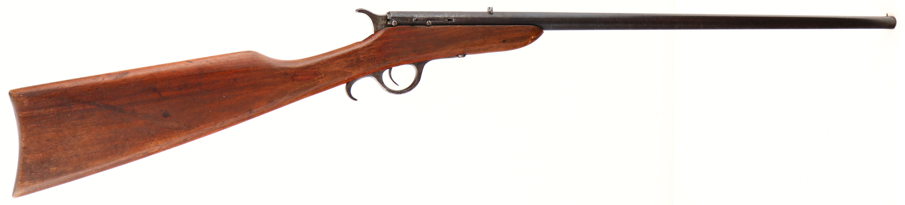 The Atlas Gun Co., Model Atlas Rifle Second Model 1906, CAL: .22 Short Black Powder Cartridges only. MFG: circa 1906, SN: NONE, Single shot rifle, 22'' barrel. The flat board straight grip stock is very good & solid, with minor scrapes, scratches & contusions to the original finish. The metal finish has worn to a mix of metal gray & areas toned to a brown patina, Bore is poor, with cleaned pitting & roughness amongst some remains of worn rifling. Fixed rear & post front sights. Fabricated without a buttplate. Front of trigger guard has broken tip where it meets the retention screw. FFL or C&R Req. - Value: 50 to 150