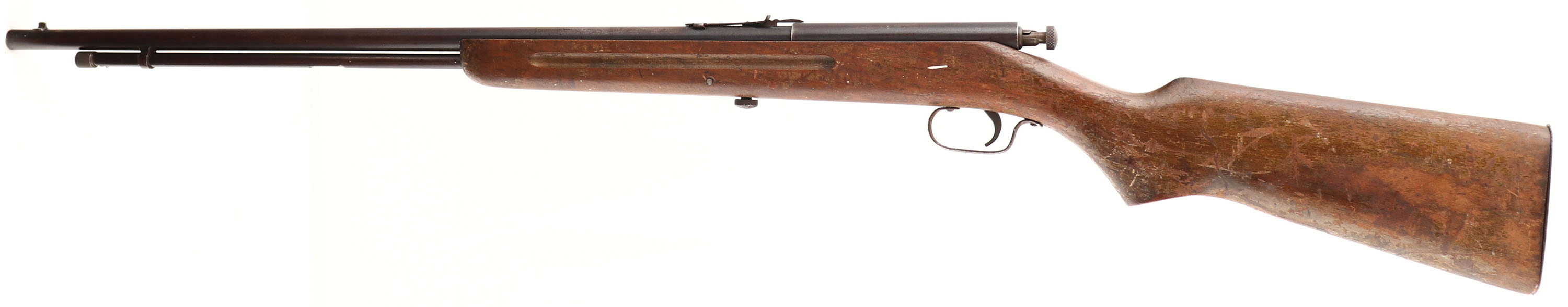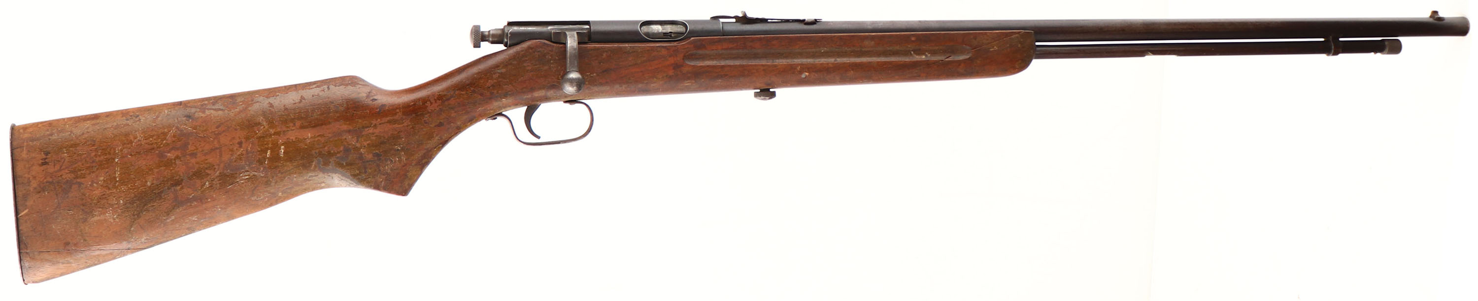Ward's Western Field, Model 31, CAL: 22 LR, MFG: circa 1930's, SN: NONE, Bolt Action Rifle, 24'' barrel. The flat pistol grip stock is fair & solid. There is a glue & metal pin repaired crack on the right side that goes from the tip of the forearm to the trigger guard & a glue repaired toe crack. The finish is heavily flaking & worn. Lots of scratches, dings & scrapes. The metal finish has worn to a mix of thinned remaining blue, gun metal gray & brown patina. Bore is excellent. Adjustable rear & blade front sight. Flat metal buttplate, missing bottom screw. FFL or C&R Req. - Value: 50 to 150
