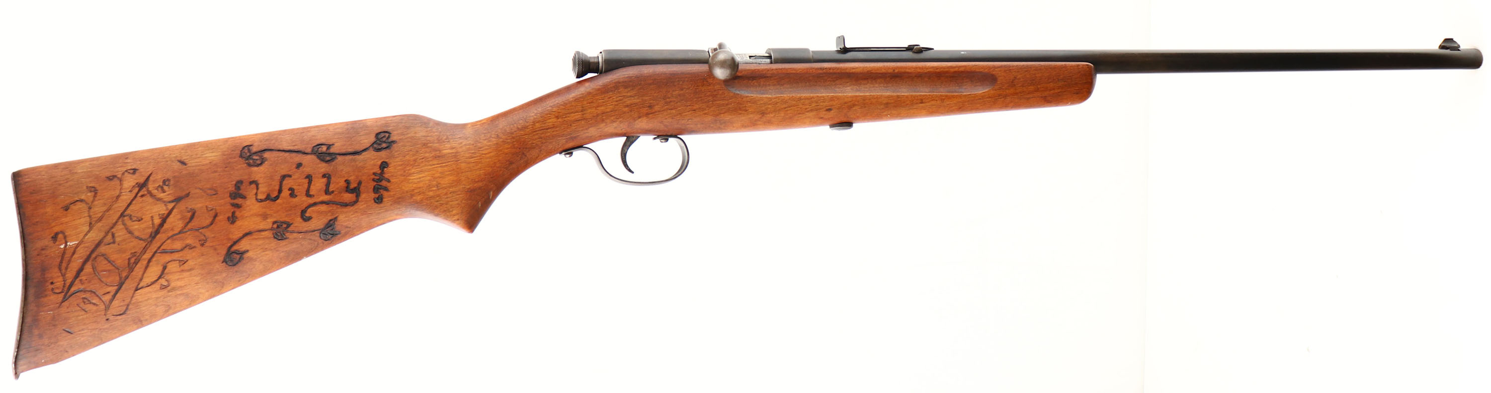 J. Stevens, Springfield, Meteor Model 52-A, CAL: .22 S,L,LR, MFG: 1929-47, SN: NONE, Bolt Action Rifle, 22'' barrel. The flat pistol grip wood stock is good & solid. The stock has been hand carved on both sides. The left side is marked ''ANNE 1970'' with a decorative border. The right side is carved ''AC 1970'' & ''WILLY 1974'' both with decorative borders. The metal blue finish on the barrel rates 50%, toning to a brown patina as it thins. Bore is good. Adjustable rear sight (missing elevator) & blade front sight. Smooth metal buttplate. The bolt stop on the sear is broken. We recommend repair by a gunsmith before utilizing. Sold ''AS-IS'' with no returns. FFL or C&R Req. - Value: 40 to 100