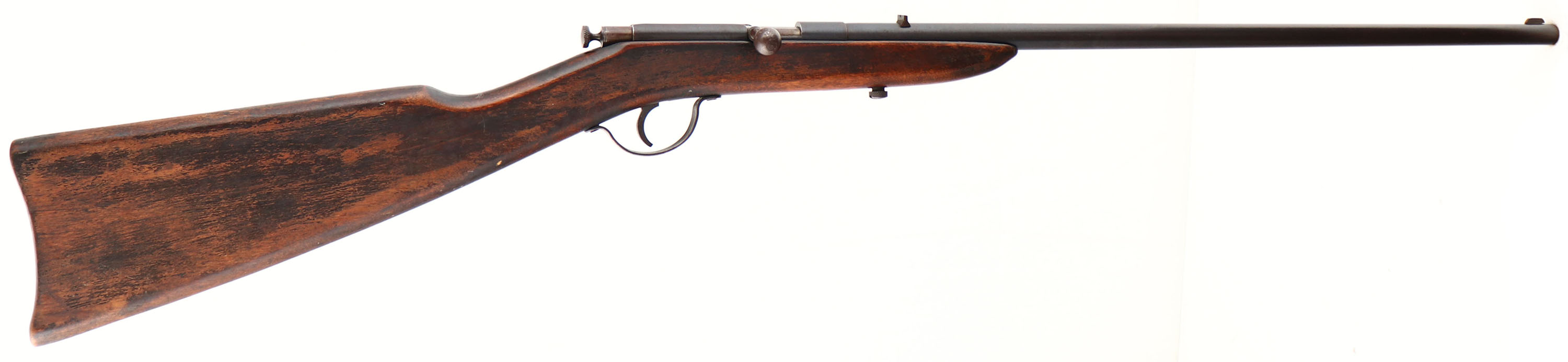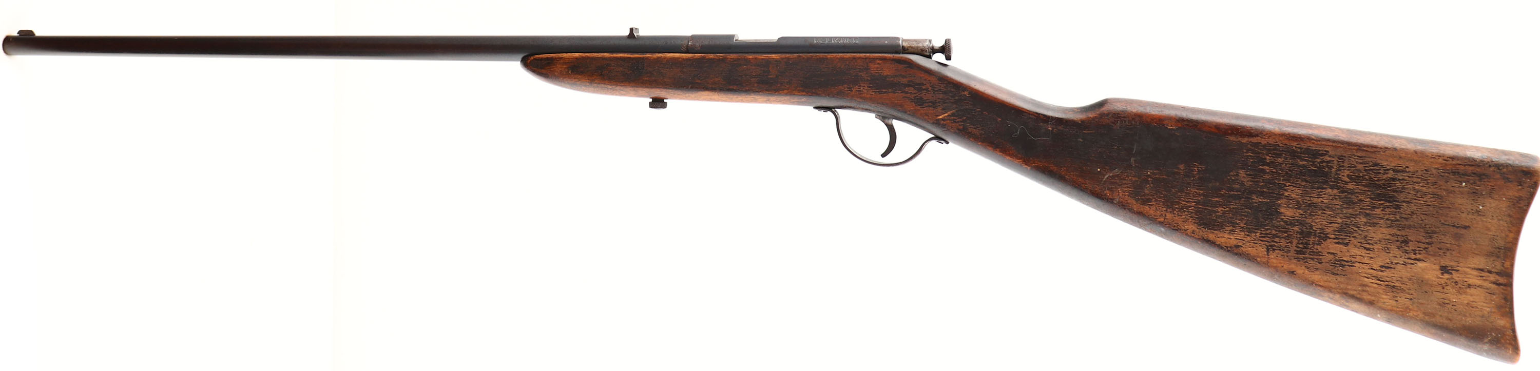 Page-Lewis Arms, Reliance - Model D, CAL: 22 S,L,LR, MFG: 1923-28, SN: NONE, Bolt Action Rifle, 20'' barrel. The straight grip flat board wood stock is very good & solid. There are minor scrapes & handling marks. The finish is heavily worn. The metal blue finish on the barrel rates 80%, with areas of thinning toning to a brown patina. Bore is good & bright, but with scarring & intermittent pitting. Fixed rear & blade front sights. Bolt handle spins freely in the bolt & has to line up correctly to close the bolt. Produced without a buttplate. FFL or C&R Req. - Value: 50 to 150