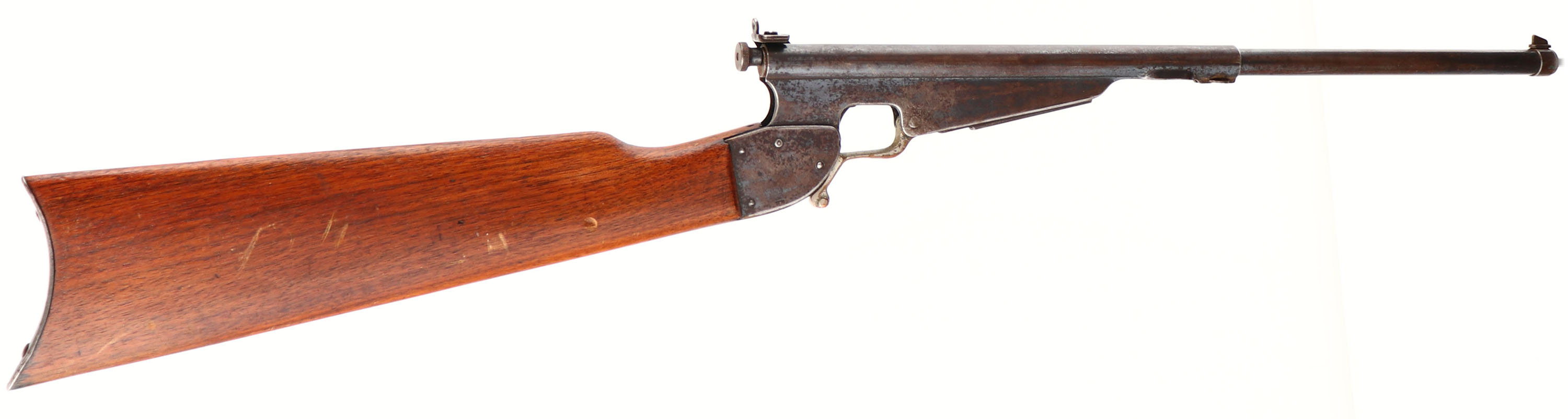 The Hamilton Rifle Co. Model 15, 22 SHORT, MFG: 1902-10 SN: NONE, Under Lever Single Shot Rifle, 8'' round barrel. 27 1/2'' OAL. The original wood stock is excellent, with small scratches & contusions to the original finish, which has an added layer of protective finish. The original metal blue has worn mostly to a brown patina, with remnants of blue in the more protected areas. The company markings & patents are stamped on left side of receiver. Steel rolled barrel, with original brass liner. The 12 groove bore, with 1 turn in 16'', r.h. twist, is fair & clean, with some roughness amongst the worn remains of rifling. Barrel fitted with blade front sight & the original rear peep sight. The brass lever retains a third of the nickel finish. Original thin metal buttplate. Just under 235,000 produced. A rare & nice example. FFL or C&R Req. - Value: 200 to 400