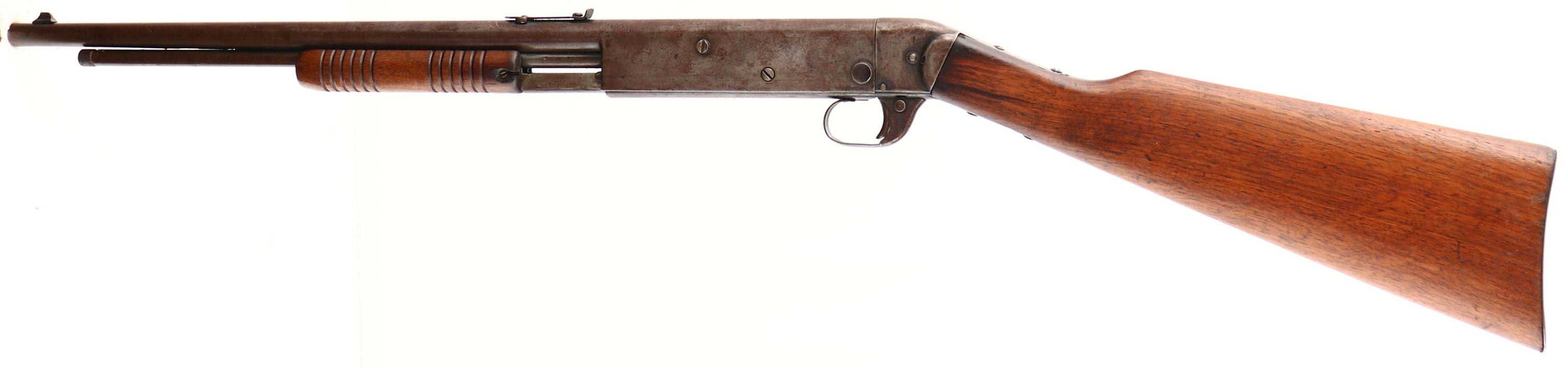 C.J Hamilton & Sons Model 39, .22 SHORT, MFG: 1922-30, SN: NONE, Pump Action Rifle, 16'' barrel. 35'' overall length. This is the only repeating rifle manufactured by Hamilton. The tubular magazine holding 15 cartridges. The wood stocks are good & solid, having been lightly sanded & refinished. There is a small chip at the retention screw of the forearm. There are also other small contusions & scratches. Metal blue finish has worn to a gun metal gray, with a thin brown patina. Steel rolled barrel, with original brass liner. The 12 groove bore with 1 turn in 16'', r.h. twist, is good, but with smoothing rifling. Barrel fitted with open adjustable rear & standard front sight. Original thin metal buttplate. A surviving example of this rare pump Hamilton. FFL or C&R Req. - Value: 120 to 250
