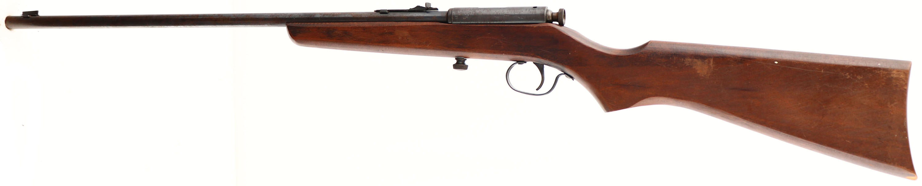 C.J Hamilton & Sons Model 51, 22 CAL S. L. & L.R, MFG: 1935-41, SN: NONE, Bolt Action Rifle, 20'' round tapered barrel. 35 1/2'' overall length. Hamilton's first conventional bolt action type rifle, with a solid steel barrel that screwed into the frame. Also, their first rifle to be marked for the long rifle caliber. The flat board type & flat pistol grip walnut stained birch stock is very good. The stock has small contusions, scrapes & scratches to the original finish. The metal blue finish has worn to mix of remaining blue & gun metal gray, with lots of spotty brown patina & speckles of rust. The 6 groove bore with 1 turn in 20'' is very good. The barrel is fitted with an adjustable rear sight & a small blade front sight. Correctly carries no buttplate. Has an open threaded hole at the rear of the receiver. Likely a quality shooter. FFL or C&R Req. - Value: 120 to 250
