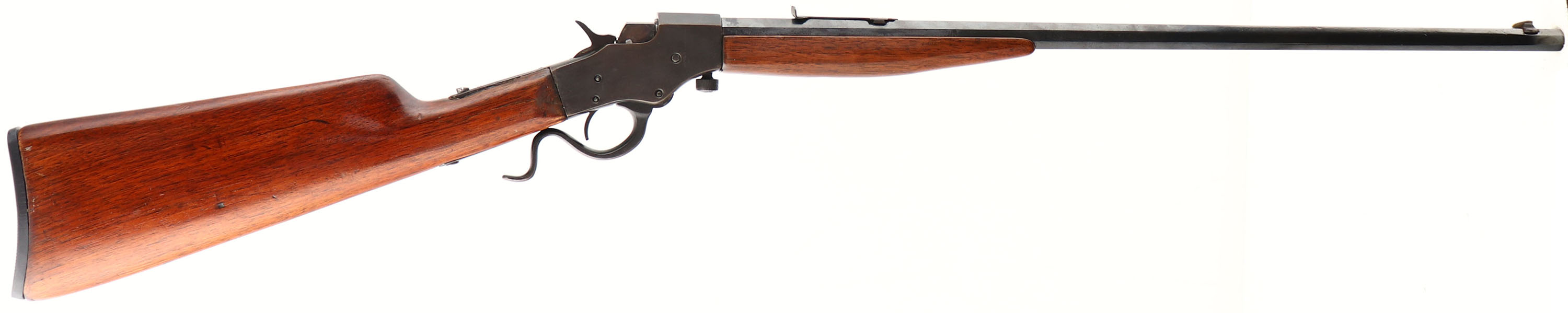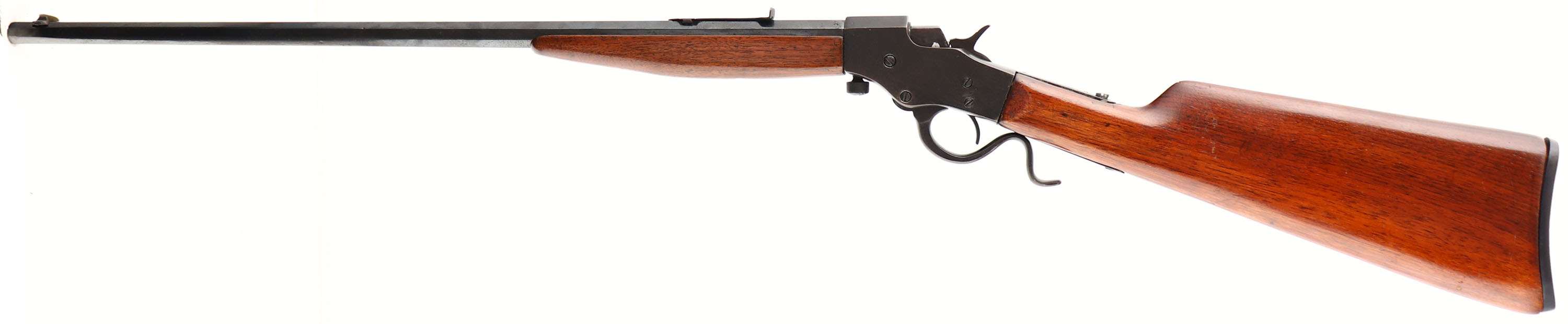 J. Stevens, Model 1915 Favorite, CAL: 22 LR, MFG: 1915-19, SN: M 717, Single Shot Falling Block Takedown Rifle, 24'' octagon barrel. The original straight grip wood stock is very good, having been sanded & refinished. There is a glue repaired 3'' crack at the left side of the wrist & a 1'' hairline crack on top at the tang. There are minor scratches & contusions remaining on the stock, The metal has been reblued, with lots of pitting underneath. Cold blue on the receiver. Barrel has a single blade front sight & an adjustable V-notch rear sight which is missing its elevator. Stevens reproduction buttplate. Bore is good to very good. FFL or C&R Req. - Value: 100 to 250
