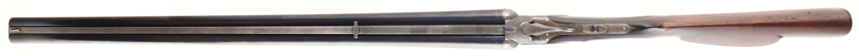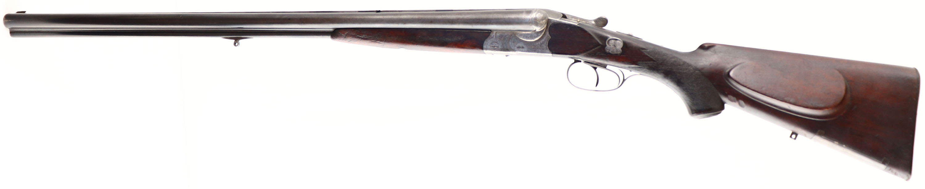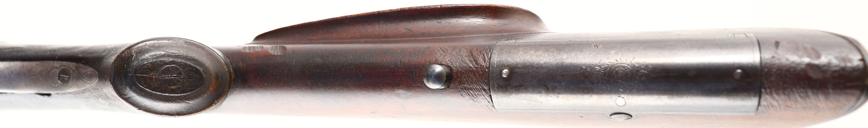 German Guild, Drilling, CAL: 16x16 & 8x57JRS (.313 Bullet), MFG: 1950's, SN: 21853, Break Action Combo Gun, 26 3/4'' barrels. The barrels are marked ''FLUS STAHL'' & ''KRUPP ESSEN'', with nitro proofs on both barrels. There are no other manufacturer markings. The checkered, capped pistol grip stock & forend are very good & solid. There is a small crack coming off the back of the upper tang, smoothed contusions, scratches, scrapes & smoothed checkering. There have been protective oils added over time & an added layer of finish. The belly of the stock has an integral 4 round chamber with push button flip-up door. The metal blue finish on the barrels rates 70% coverage, toned to a brown patina, with areas worn to metal gray & toned to a thin brown patina. The case-hardened receiver has externally worn to metal gray & toned to a brown patina, with case-colors remaining on the inside of the receiver. The receiver, trigger guard, break lever, safety switch & forend break lever all display intricate ornamental scroll engraving. Shotgun bores are very good, with light scarring, roughness near the chamber & visible striations. The rifled bore is excellent. The rifle is fitted with a tang switch activated flip up rear sight. & beaded blade front sight. Stock has a checkered plastic buttplate. FFL or C&R Req. - Value: 1000 to 3000