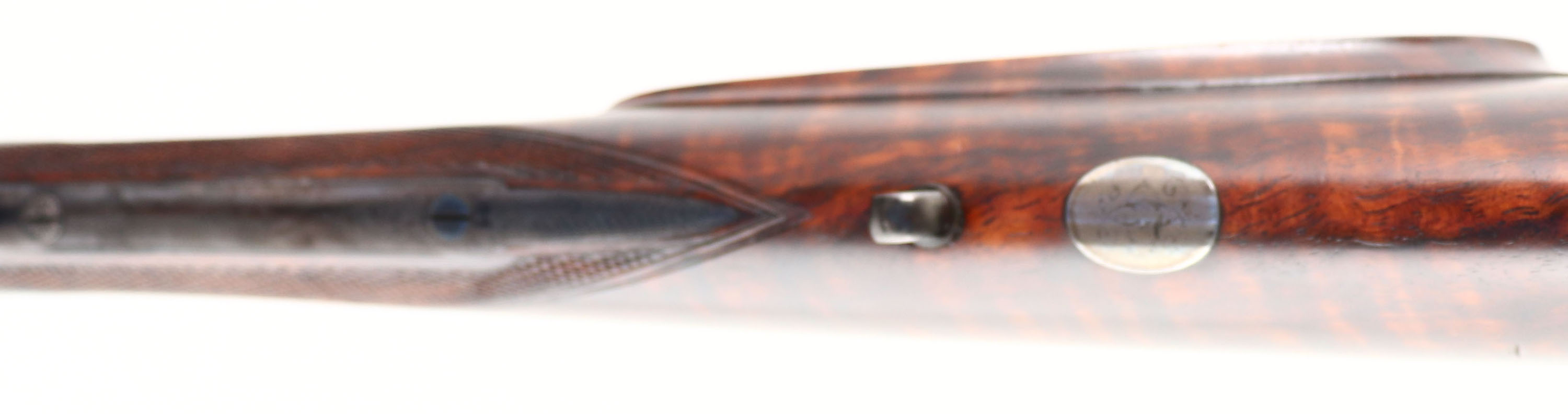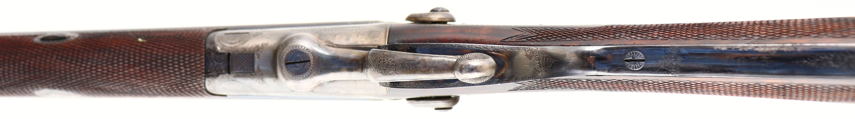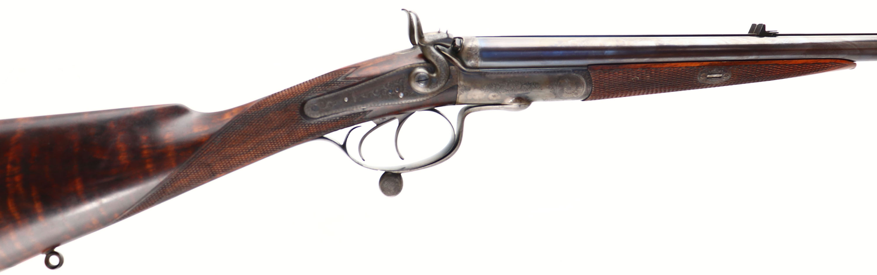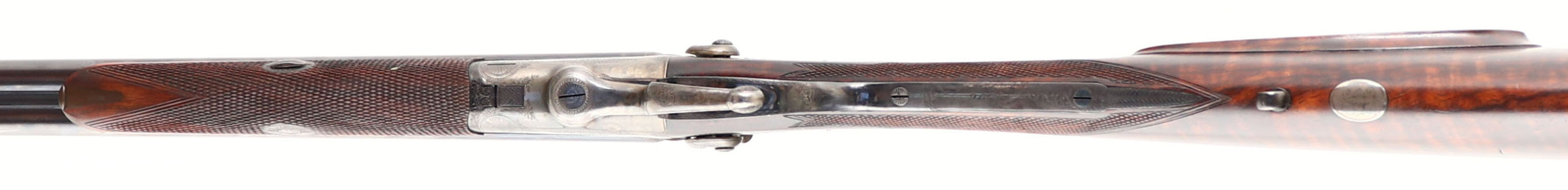 RARE & FABULOUS, J. Purdey, Jones Patent Underlever Hammer Express Rook Rifle, CAL: .360 #5 Rook, MFG: 1876-77, SN: 9675, Break Action SxS Rifle, 26 7/8'' barrels. The rib is marked ''J.PURDEY, 314 1/2, OXFORD STREET, LONDON''. The side plates are marked ''PURDEY''. The full SN can be found on the lower tang & barrel. The original checkered straight grip wood stock, with beaded cheek & inlaid forend tip are excellent. There are only contusions & a couple handling marks to the finish. There is an inscribed oval initial plate in the belly with the initials ''DC'' in cursive. The original metal blue finish on the barrels rates 99% & has toned to a nice, even plum patina. The trigger guard has retained the blued tone, with minor spotting on the left side above the SN. The case-hardened receiver retains excellent case-colors, with a thin brown patina coverage. Bores are both excellent & bright. 3-tier folding leaf rear sight & beaded blade front sight. The stock & barrel rib hold sling studs. Checkered butt. This rifle is accompanied by a copy of a Purdey Letter, confirming the date & other pertinent information. Antique, No FFL Req. - Value: 15000 to 20000