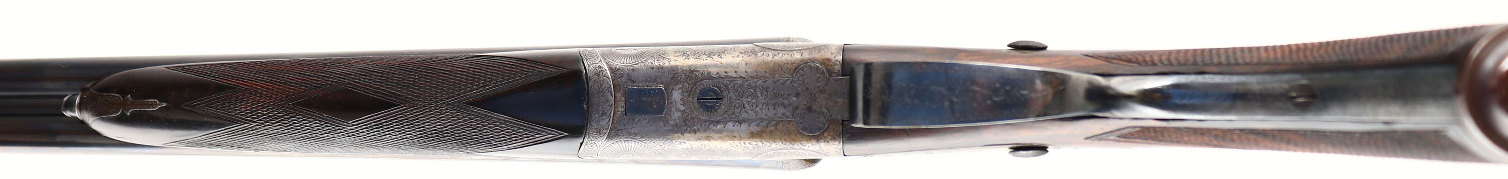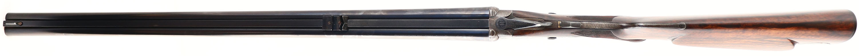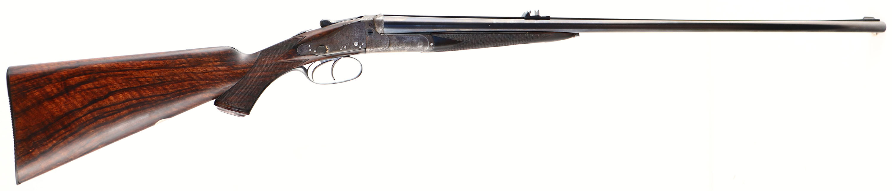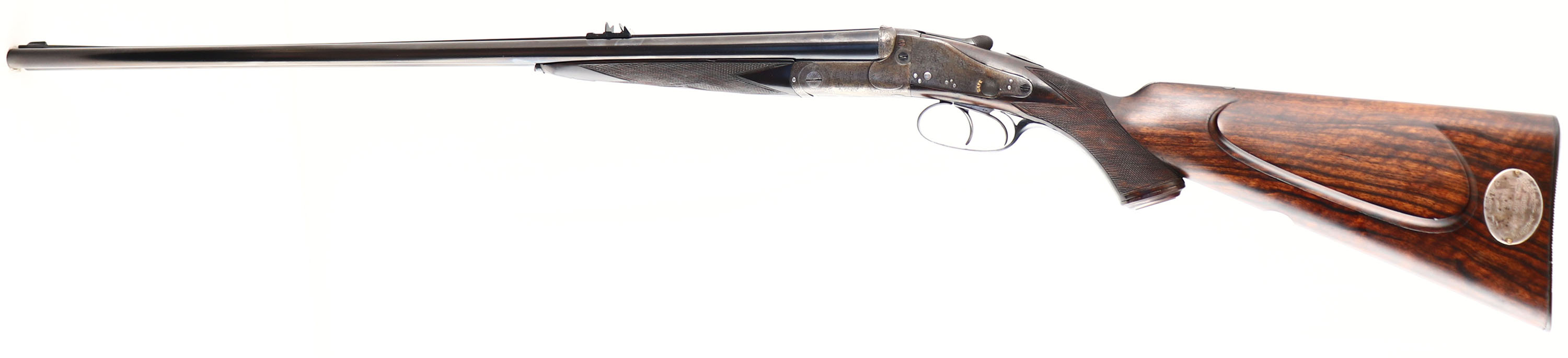 Holland & Holland, Double Rifle, CAL: 450/400 2 3/8'', MFG: circa 1880's. SN: 11257 (22000 SN Dates 1899), Break Action SxS Rifle, 26'' barrel. This rifle has been fully & professionally restored. The silver oval plaque on the left side of the stock reads ''TO RAOBAHADUR DADASHEB SURVE PRIME MINISTER KOLHAPUR BY S.R. DESAI OF CHINCHALI''. The side plates are marked ''HOLLAND & HOLLAND''. The right barrel is marked ''HOLLAND & HOLLAND 98 NEW BOND STREET, LONDON'' & the left barrel is marked ''WINNERS OF ALL ''FIELD'' RIFLE TRIALS LONDON 1883'' The checkered, capped pistol grip stocks are excellent. There are two small repaired cracks on either side of the upper tang, small edge chips, a dowel fill where the sling stud was & minor handling marks. There is a blank oval initial plate on the belly of the stock. The metal blue finish on the barrel rates 99%. The front sling provision has been removed. The case-hardened receiver has fully worn to metal gray, with applied brown patina. There are remnants of case-colors on the inside of the receiver on the firing pin face & floor plate. The word ''SAFE'' on all three safety levers is gold inlaid. The receiver, side plates, trigger guard, break lever, cap & forend meal components all display beautiful & intricate ornamental scroll engraving. Bores are very good, appearing slightly grainy. The solid, matted rib holds a 3-tier folding leaf rear sight, with graduations from 50-250 & a beaded blade front sight. Tang safety & separate barrel safeties on both sides of the receiver. Grooved plastic buttplate. This rifle comes with a set of custom made 450-400 2 3/8'' dies. Although this rifle has been restored, it still presents excellently. Antique, No FFL Req. - Value: 10000 to 12000