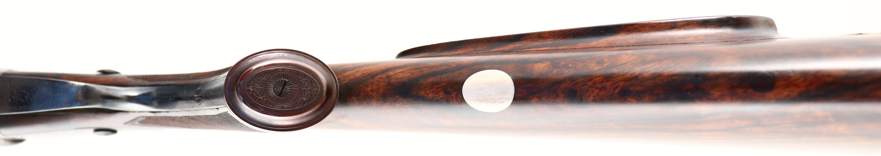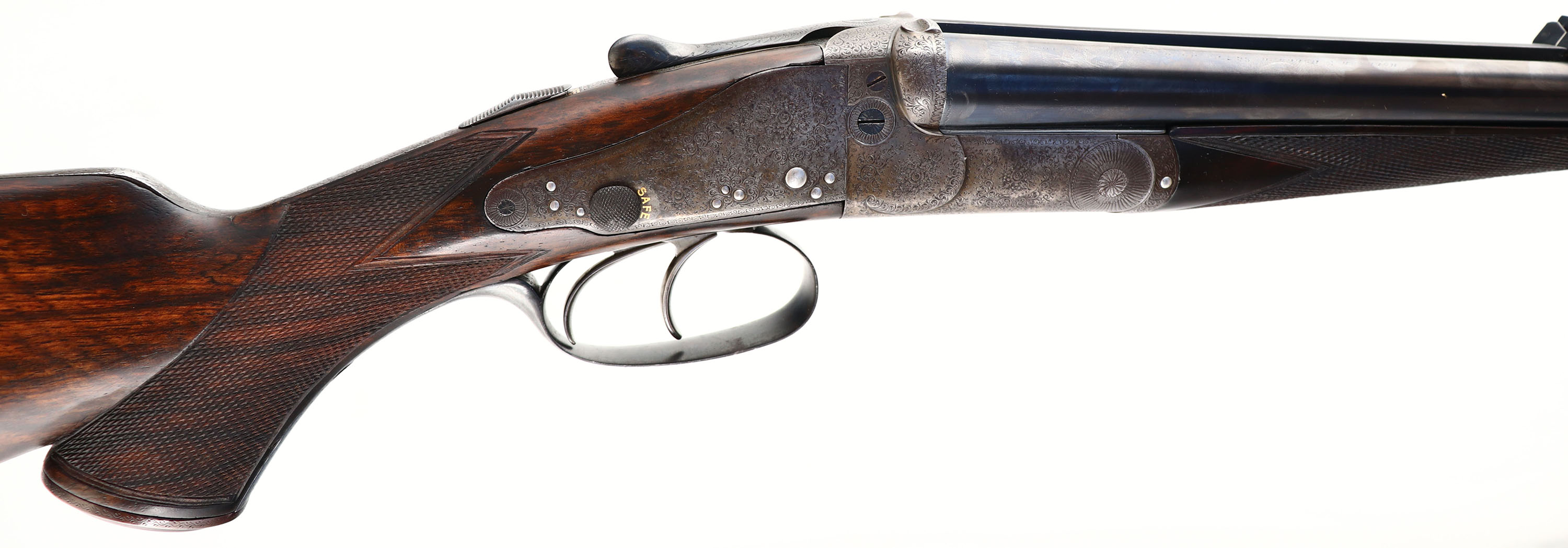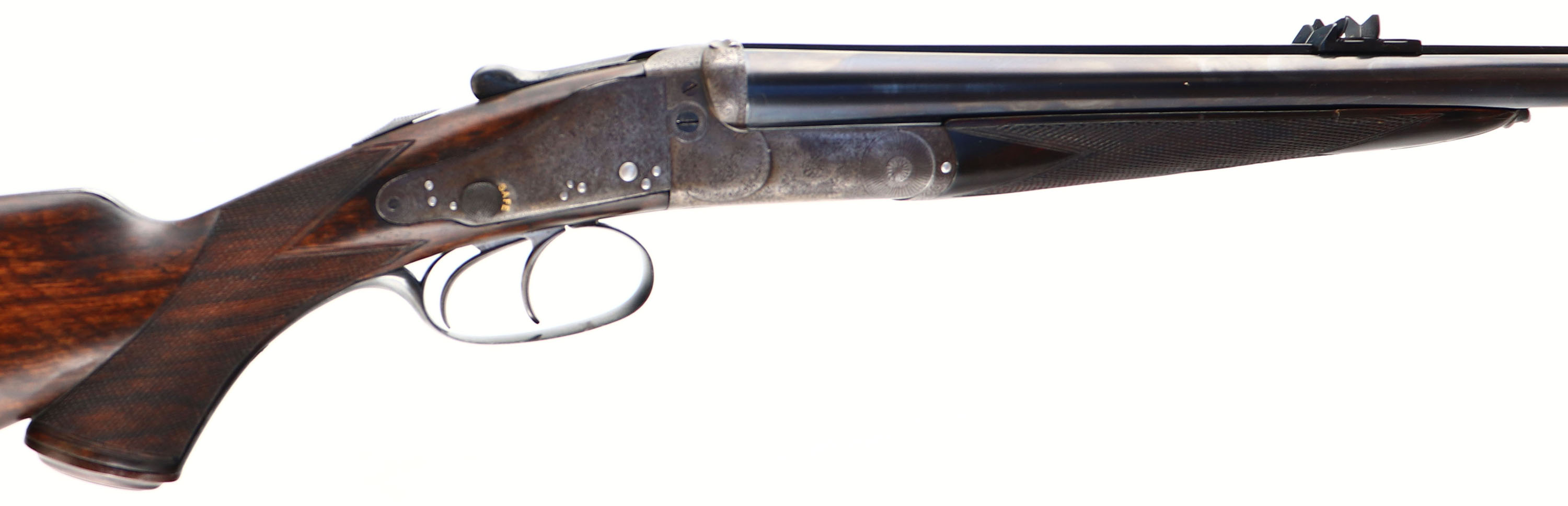 Holland & Holland, Double Rifle, CAL: 450/400 2 3/8'', MFG: circa 1880's. SN: 11257 (22000 SN Dates 1899), Break Action SxS Rifle, 26'' barrel. This rifle has been fully & professionally restored. The silver oval plaque on the left side of the stock reads ''TO RAOBAHADUR DADASHEB SURVE PRIME MINISTER KOLHAPUR BY S.R. DESAI OF CHINCHALI''. The side plates are marked ''HOLLAND & HOLLAND''. The right barrel is marked ''HOLLAND & HOLLAND 98 NEW BOND STREET, LONDON'' & the left barrel is marked ''WINNERS OF ALL ''FIELD'' RIFLE TRIALS LONDON 1883'' The checkered, capped pistol grip stocks are excellent. There are two small repaired cracks on either side of the upper tang, small edge chips, a dowel fill where the sling stud was & minor handling marks. There is a blank oval initial plate on the belly of the stock. The metal blue finish on the barrel rates 99%. The front sling provision has been removed. The case-hardened receiver has fully worn to metal gray, with applied brown patina. There are remnants of case-colors on the inside of the receiver on the firing pin face & floor plate. The word ''SAFE'' on all three safety levers is gold inlaid. The receiver, side plates, trigger guard, break lever, cap & forend meal components all display beautiful & intricate ornamental scroll engraving. Bores are very good, appearing slightly grainy. The solid, matted rib holds a 3-tier folding leaf rear sight, with graduations from 50-250 & a beaded blade front sight. Tang safety & separate barrel safeties on both sides of the receiver. Grooved plastic buttplate. This rifle comes with a set of custom made 450-400 2 3/8'' dies. Although this rifle has been restored, it still presents excellently. Antique, No FFL Req. - Value: 10000 to 12000