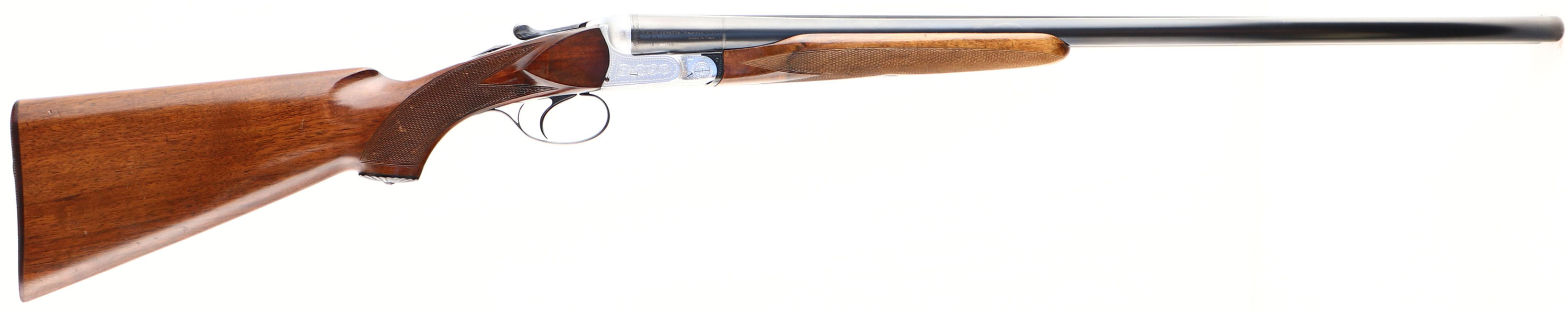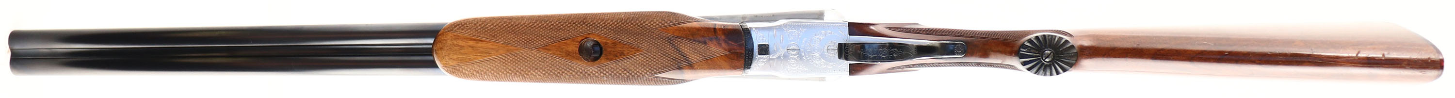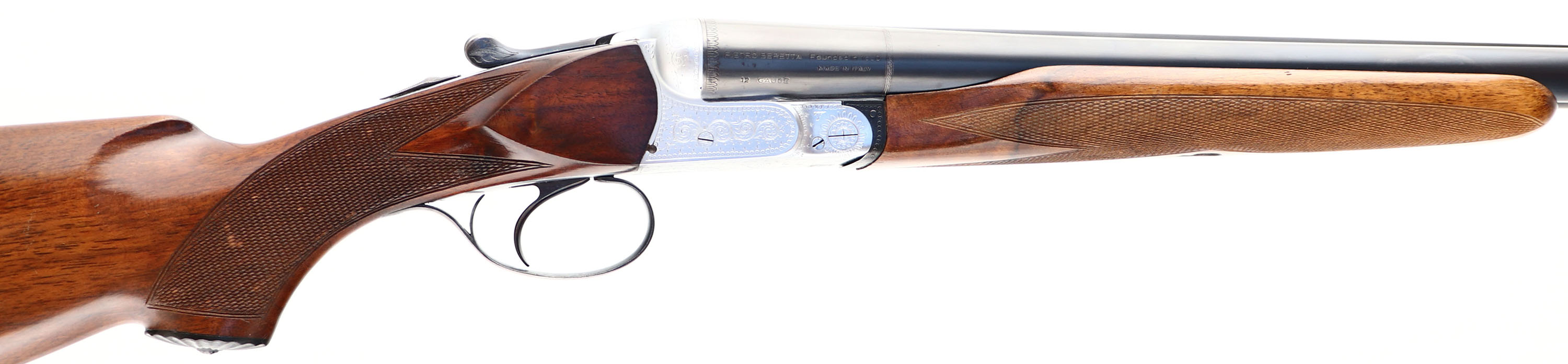 P. Beretta, Silver Hawk, CAL; 12GA, MFG: 1961, SN: C48556, Break Action SxS Shotgun, Choke: F/IC, 28'' barrels. The checkered & capped pistol grip stocks are excellent. There are scrapes & dings to the high gloss finish. The metal blue finish on the barrels rates 98% & the coin silver receiver is bright. The receiver, trigger guard, break lever, barrels & safety switch all display intricate ornamental scroll engraving. Bores are excellent. The solid matted rib holds a single front bead. Stock carries a Beretta checkered plastic buttplate. An excellent representation of an orignal Silver Hawk from the 60's. FFL or C&R Req. - Value: 1300 to 2000