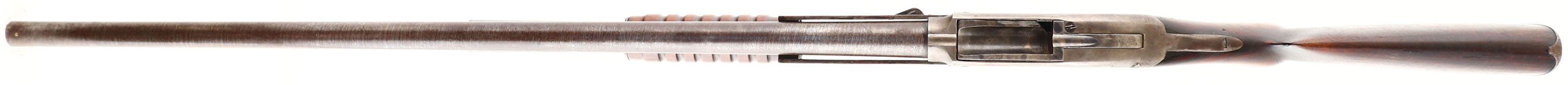 F.Bannerman, Model 1896 Spencer Repeating Shotgun, CAL; 12GA, MFG: 1897-98, SN: 17173, Pump Action Shotgun, 30'' barrel. The Spencer-Roper Pump Action Shotgun was the first commercially successful pump shotgun, while not the first design to use a slide action, it was the first to be mass produced & successfully sold. Co-designed by Christopher Spencer, perhaps best known for his repeating rifle, & Sylvester Roper. The pump action was not Ropers first shotgun design, in 1866, he patented a revolving shotgun & in 1889 he developed another pump action design. In April 1882, Spencer & Roper were granted a patent on their design & subsequently established the Spencer Arms Company in Amherst, Massachusetts. They introduced the Spencer Model 1882, based on their pump action designs. Chambered in 10 & 12 ga, with the latter being the most popular, the 1882 has a tubular magazine below the barrel which holds five black powder shells. The Spencer-Roper has a complex action, by cycling the pump the guns pivoted breech block drops below the receiver allowing the next shell to enter the action while almost simultaneously the spent shell is ejected out the top of the gun. What appears to be another trigger facing backwards inside the trigger guard is actually the hammer spur. Ergonomically the early shotguns had very small pump handles & deeply swept stocks this changed in this later model 1896, with larger pump handles being introduced. By 1885, Spencer was in serious debt & sold the patent rights to Francis Bannerman. Bannerman starting putting his name on the side & called them the model 1896. According to resources, he made this model from late 1895- 1898 going to appx SN 18,000. The original round knob wood stock & grooved forend are very good & solid. There are a couple popped grains at the heel, along with contusions, scrapes & dings, with added protective oils contributing to darkening of the finish. The browned finish on the laminated steel barrel is very good, with a clear laminated pattern. The case-hardened receiver has shadows & remnants of faded case-colors. Bore is very good & bright, with visible striations from use. Barrel has a worn front bead. Checkered widow's peak metal buttplate. Antique, No FFL Req. - Value: 500 to 1000