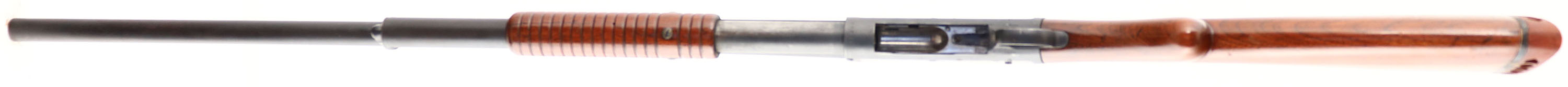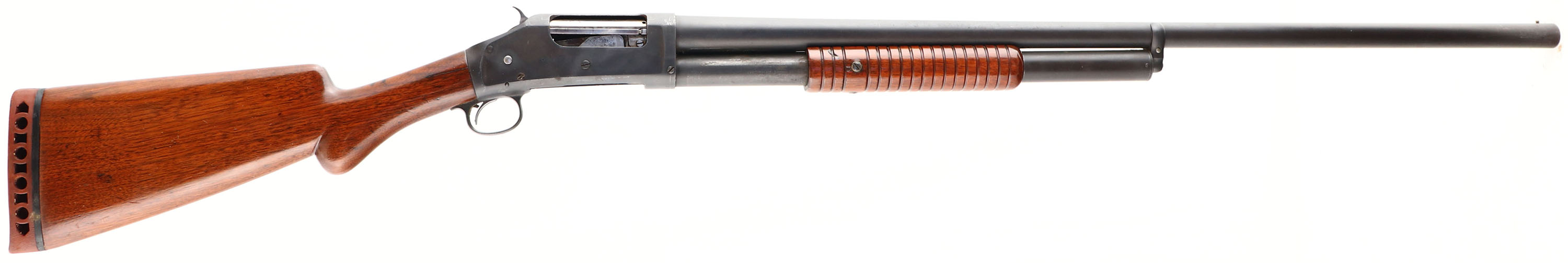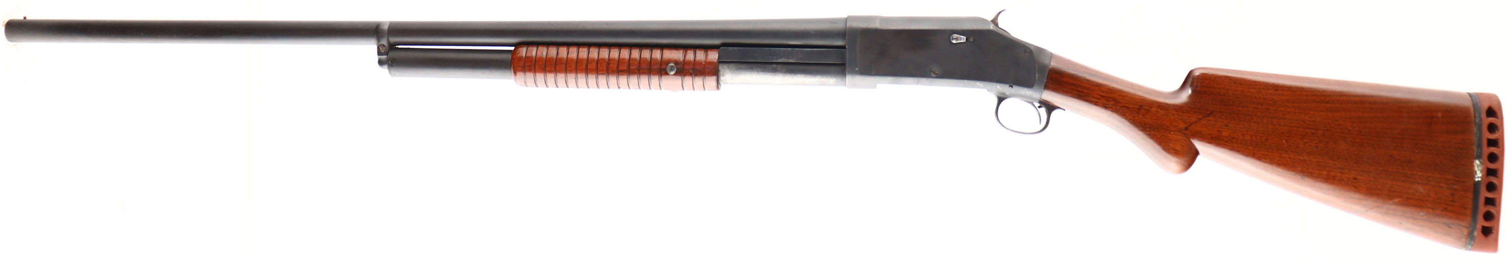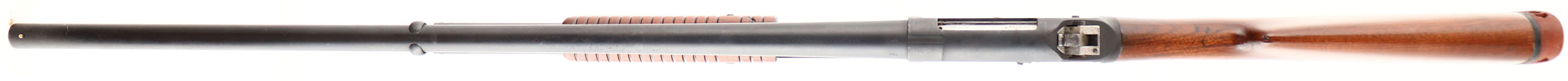 RARE EARLY Winchester Model 1897 SOLID FRAME, CAL: 12 GA, MFG: 1903, Antique, SN: 195298, Pump Action Shotgun, 2 3/4'', Choke: Full. 30'' Barrel, Early production. The Winchester Model 1897 was designed by American firearms inventor John Moses Browning. The Model 1897 was an improved version of the model 1893 & was first listed for sale in the November 1897 Winchester catalog as a 12 ga solid frame, furnished with standard 30'' barrels. The 12 ga take-down model was added in Oct 1898, & the 16 ga take-down in Feb 1900. The original round knob pistol grip wood stock & corncob forearm have been nicely refinished. The high gloss finish shows a few nicks & dings. The metal has a matte refinish, with some pitting underneath. Bore is fair. Barrel holds a single front bead. Buttstock carries a ventilated Ranger buttpad. LOP: 13 5/8'' over pad. FFL or C&R Req. - Value: 300 to 600
