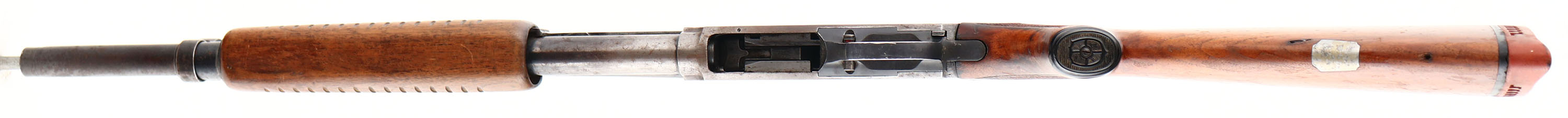 J.C. Higgins, Model 20, CAL: 12 GA, MFG: 1946-61, SN: None, Pump Action Shotgun, Choke Full, 2 3/4'' Chamber, 19'' barrel. The original capped pistol grip wood stock & forend are very good, displaying a few scrapes & scratches to the original finish. Blank silver initial shield in belly of the stock. The original metal blue finish rates 40% and thinning with speckling through out. Bore is very good. Brass front bead. Buttstock carries a factory ventilated recoil pad. LOP: 14'' overpad. FFL or C&R Req. - Value: 100 to 200