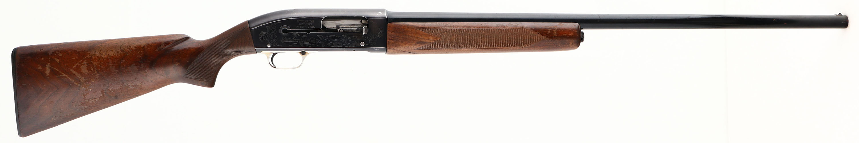 Winchester, Model M59 WIN-LITE, 12 Ga, MFG. 1959-65, SN: 10643, Semi Auto, 3 Shot Shotgun, 2 3/4'', Full, Choke, 30'' fiberglass barrel with silver bead front sight (they used fiberglass lined barrels to cut weight), The checkered & flat pistol grip stocks are very good, with numerous minor nicks, dings & contusions to the original finish, the fiorend has a 2'' crack on the left side. The anodized black finish is 90% on the steel/fiberglass barrel & alloy metal receiver, with several minor scratches on the machine engraved receivers. Bore is excellent. Winchester factory checkered buttplate. FFL or C&R Req. - Value: 200 to 400