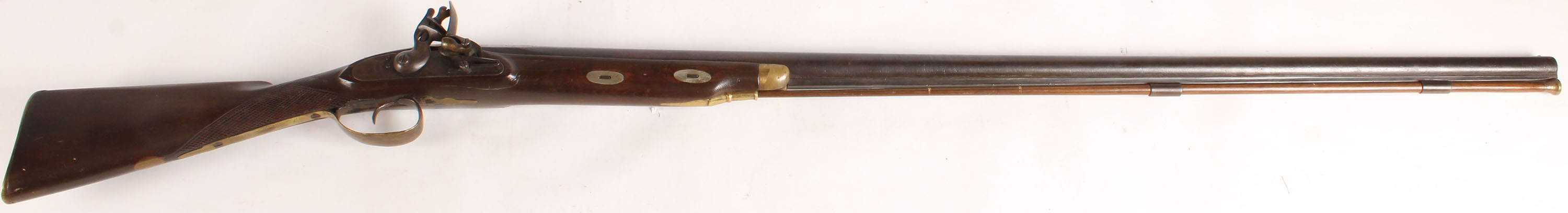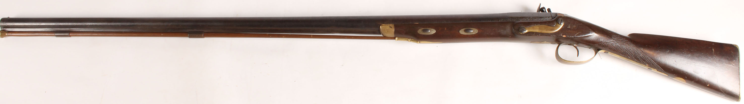 Tower Proof, custom made muzzleloader, .92 Cal Smoothbore Flintlock, 47 1/8'' barrel. The checkered straight wrist stock is very good with nicks, dings, gouges, scratches & wear from use/age all the brass furniture has a light patina & haze. The metal has toned to a chocolate brown patina with spots of cleaned pitting & rust speckling the lock is marked ''TOWER'', ''PROOF'', the marking is worn & faded from cleaning rust & pitting off the lock. The bore is poor, has lots of rust & pitting. The barrel holds a bead front sight. The stock carried a brass buttplate. Gun comes with a ramrod. This gun appears to have been put together by a person or a gunsmith with bought or salvage parts, the lock is a old British proofed lock, likely taken off a old brown Bess. A very nice example of a old antique flintlock. Muzzleloader No FFL Req. - Value: 1000 to 2500