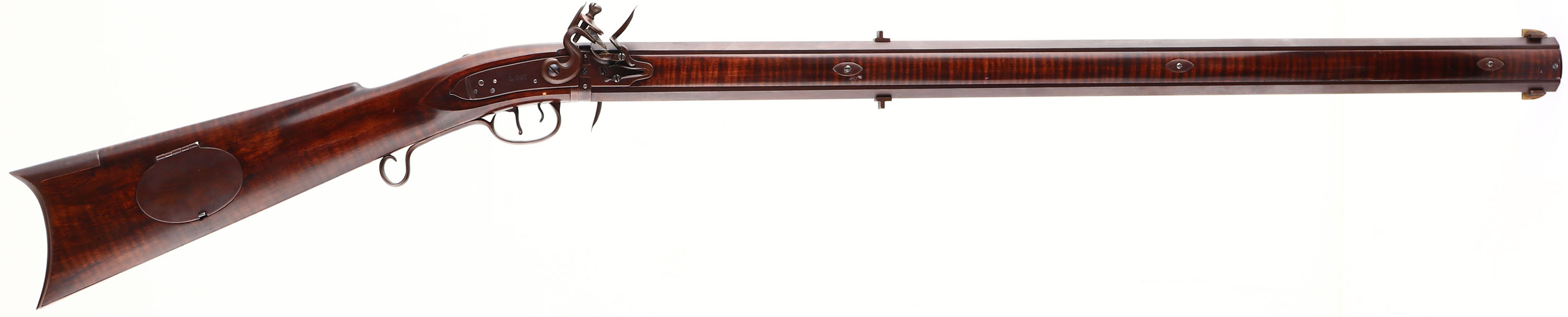 L. Day, Revolving Rifle, CAL: 50, MFG: 1970's, SN: 411, Flintlock Muzzleloader, 32'' octagon barrels. A well-made modern reproduction. Marked ''L.DAY'' on the right side plate. The straight grip wood stock is excellent, with minor handling marks. Integrated patch or bullet holder in right side of stock. All metal components have been nicely browned. One bore rate is excellent, the other one rates good, due to darkness & consistent roughness. Fixed rear sights & blade front sight on both barrels. Crescent metal buttplate. Mechanically sound. Overall, a nice & unique flintlock rifle. Blackpowder, No FFL Req. - Value: 1000 to 2000