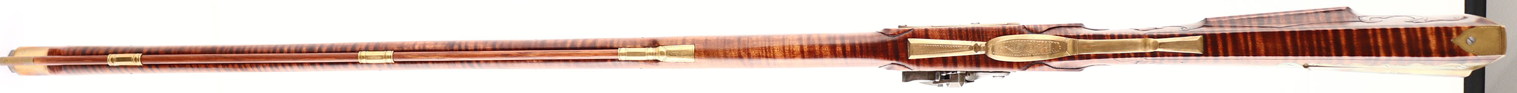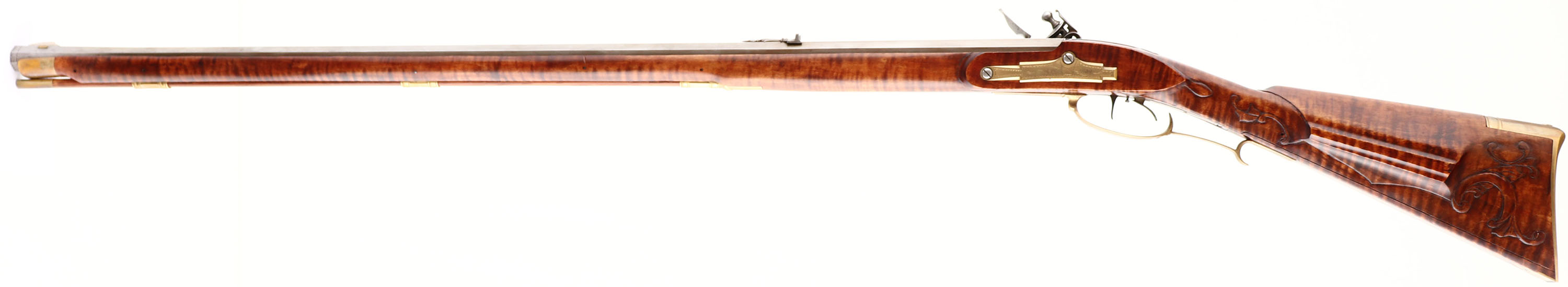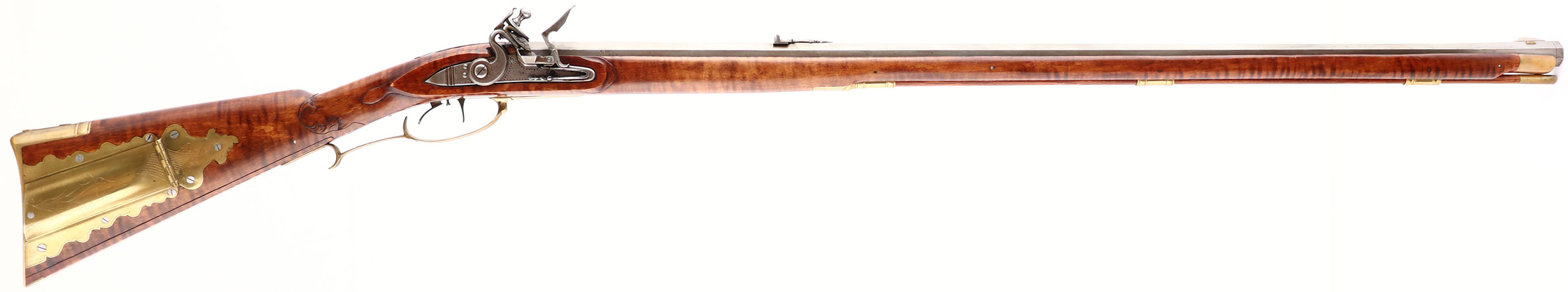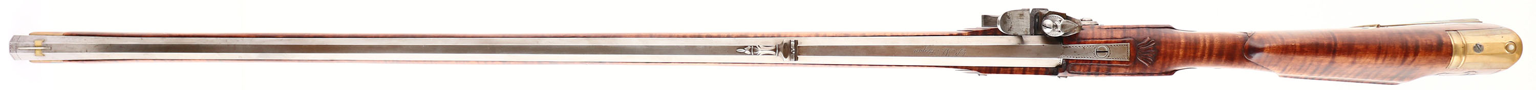P.M Hogan, Flintlock Rifle, CAL: 50, MFG: 1960's-70's, SN: NONE, Muzzleloader Rifle, 38'' octagon barrel. The top of the barrel is marked ''P.M. HOGAN''. The tiger striped wood stock is excellent. It displays carvings on both sides. The barrel has been left ''in the white'' with a thin brown patina. Brass components are excellent & bright. Decorative engravings can be seen throughout the rifle. Spring loaded trap door in stock for patches, wads or bullets. Fixed rear sight & blade front sight. Bore is excellent. Brass buttplate. Blackpowder, No FFL Req. - Value: 700 to 1000