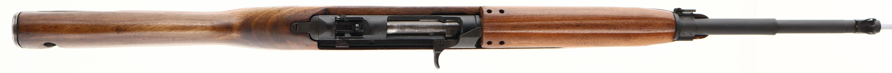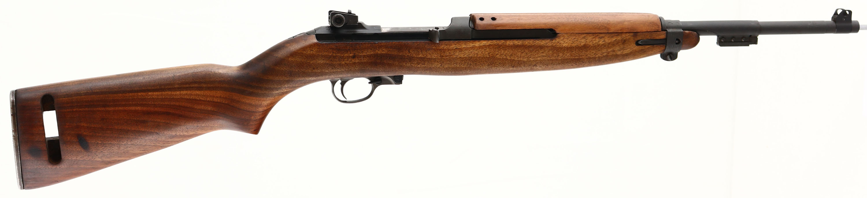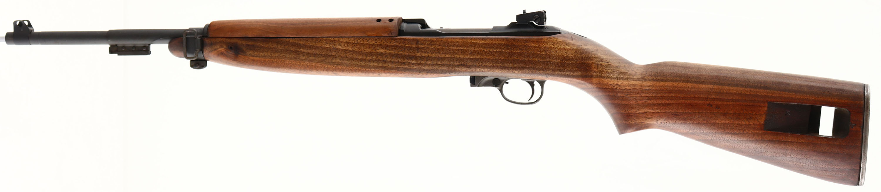 Inland Division, Model: M1 Carbine, Cal: .30 Carbine, MFG: 1942-45, S/N: 208907, Semi-auto rifle, 17 3/4'' barrel. The semi-pistol grip, Type 4, potbelly wood stock is excellent. There is a faint ''P'' stamp on the bottom of the wrist. The left cheek of the stock has a faint ''AN'' stamp. The sling well is marked with a ''M''. The parkerized metal finish has been re-done at some point, evident by the front receiver markings being partial buffed away. The metal finish has full coverage & rates 98%. The re-park job appears to have been done at a arsenal. The receiver band is marked ''ARBINE'', ''.30M1''. The rear of the receiver is marked ''INLAND DIV'', & the S/N. the top end of the barrel is marked ''INLAND MFG DIV'', ''GENERAL MOTORS, ''3-44''. The barrel band is marked ''KI''. The bore is excellent. Its bright & mirror like with minimal wear. The barrel holds a wide blade front sight with protective wings. The rear of the receiver holds a fully adjustable aperture rear sight. The stock carries a checkered steel buttplate with areas of light rust. The rifle does not come with a mag. FFL or C&R Req. - Value: 1000 to 2000