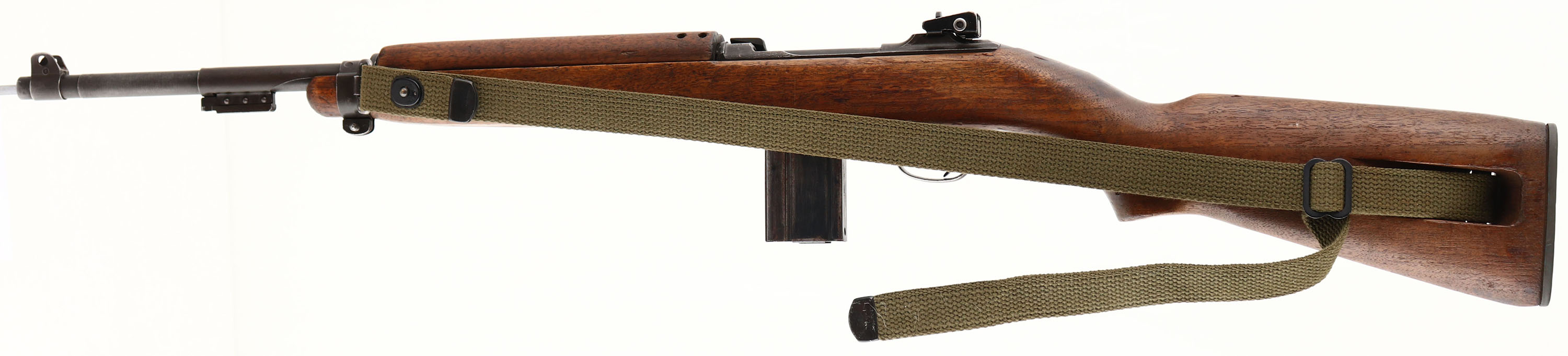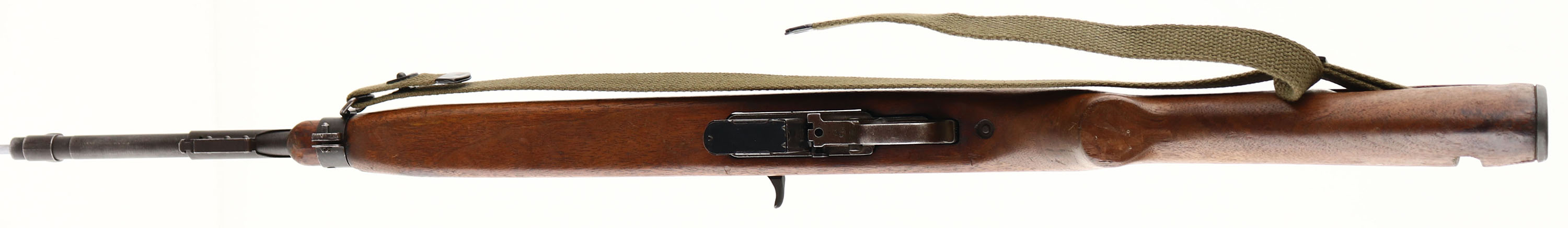 Underwood, Model: M1 Carbine, Cal: .30 Carbine, MFG: 1943, S/N: 1400594, Semi-auto rifle, 17 3/4'' barrel. The semi-pistol grip, Type 3 wood stock is very good with minor nicks, dings, scratches, & wear from use/age. There are faint remains of white paint marking on the right cheek of the stock. There is a 3/4'' tight crack on the top of the wrist that emanates from the upper tang. The parkerized metal finish has full coverage & rates 80% with areas of wear & thinning. The receiver band is marked ''U.S.CARBINE'', ''CAL. .30M1''. The rear of the receiver is marked ''UNDERWOOD'', & the S/N. the top end of the barrel is marked ''UNDERWOOD'', ''2-43'', US ordinance flaming bomb, & ''P''. The barrel band is marked ''AI''. The bore is excellent. Bright & mirror like with minimal wear. The barrel holds a wide blade front sight with protective wings. The rear of the receiver holds a fully adjustable aperture rear sight. The stock carries a checkered steel buttplate. The rifle has the oil bottle/ rear sling mount & the left side front sling loop. Rifle comes with a period correct canvas sling, oiler bottle, & one 15 Rd. magazine marked ''IS'' on the back. FFL or C&R Req. - Value: 1000 to 2000