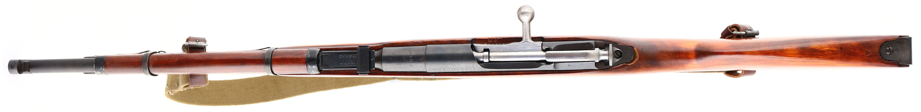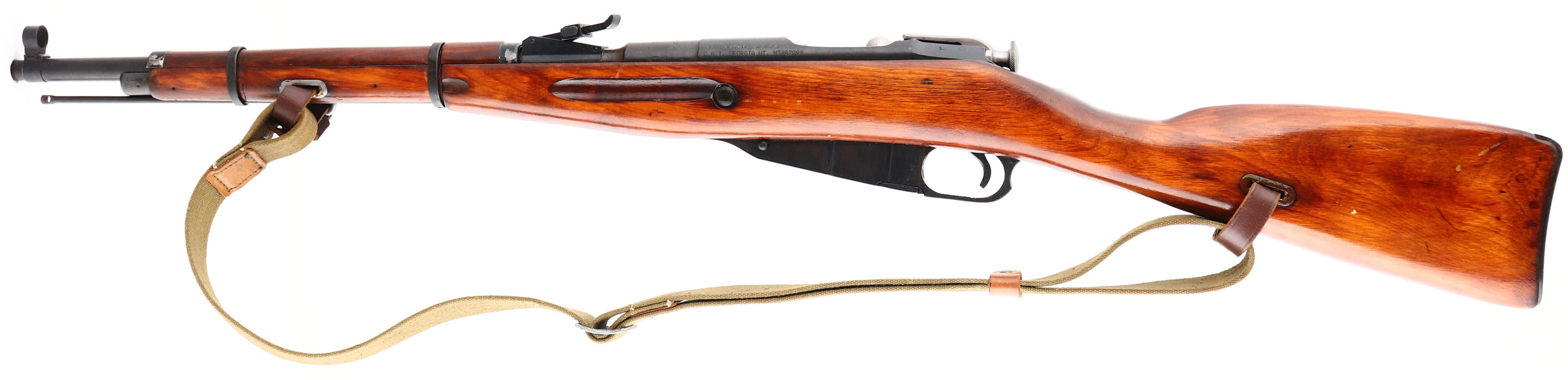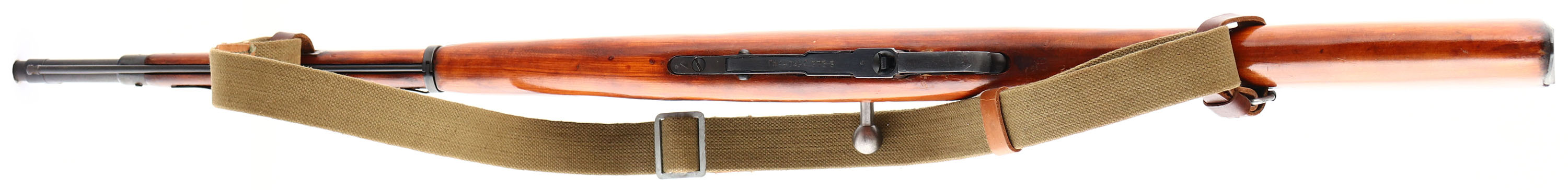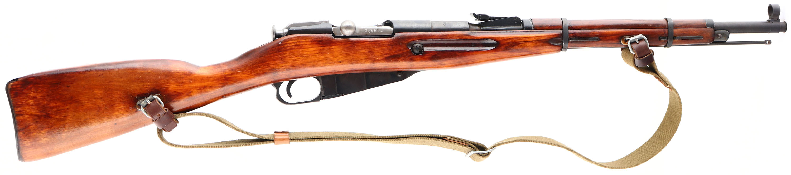 Izhevsk, Model: M38, Cal: 7.62x54mmR, MFG: 1942, S/N: M3807088 (barrel S/N rH4402), Bolt action rifle, 20 3/4'' barrel. The straight wrist wood stock is excellent with minimal wear. Stock has a few spots of running shellac stock finish. There are a few faint cartouches on the bottom of the wrist, the bottom of the stock in front of the magazine, the top rear of the comb, & both cheeks of the stock. There is a ''5'' stamped into the top edge of the right side of the stock, right in front of the bolt handle. The metal finish rates 90% with light wear. Many of the markings are faint due to the buffing & re-bluing done when it was refurbished after the war. Top of the barrel is marked with a hammer & sickle in wheat wreath stamp, ''1942'', the original Russian S/N, arrow in triangle, & many other proof marks. Left side of receiver is stamped with import marks. Bolt, magazine floor plate, & buttplate are all S/N matched, the floorplate was forced matched to the rifle. Bore is very good, its bright with light roughness near the muzzle, barrel has been counter bored. Barrel holds a post front sight with protective globe, tangent U-notch rear sight marked 1 to 10. stock carries a blued steel buttplate that is marked with the S/N. rifle has both sling wells for use with a leather ''dog collars'' & sling. Rifle comes with a green canvas sling. Rifle has its cleaning rod. FFL or C&R Req. - Value: 250 to 500