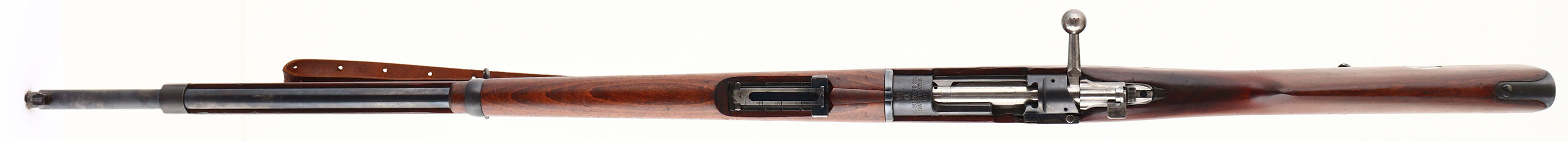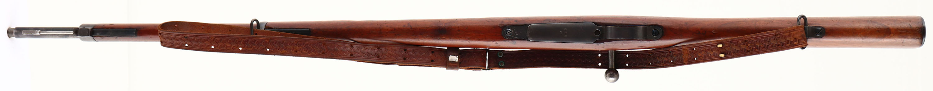 Carl Gustafs Stads Gevarsfaktori, Model: M1896, Cal: 6.5x55mm, MFG: 1917, S/N: 408552, bolt action rifle, 29'' barrel. The straight wrist wood stock is very good with various small nicks, dings, dents, scratches, & wear from use/age. The bottom of the wrist has a crown over ''B'' cartouche. The metal is proud to the wood around the front of the magazine floorplate. The right cheek of the stock has a embedded brass bore disc. The metal finish rates 90% overall with light scratches & areas of light thinning. The top of the receiver is marked with a crown, ''CARL GUSTAFS STADS GEVARSFAKTORI'', ''1917''. The left side of the receiver is marked with the S/N, & ''H.K'' which is the Inspector initials of Kapten, Helge Gustaf Ludvig Kolthoff, who was a Inspection Officer at the Carl Gustafs plant from April 1, 1912 to February 28, 1923, making him the longest serving inspector at the Carl Gustafs plant. The end of barrel stamped with importer marks. S/N matched bolt, magazine floor plate, buttplate, & all other smaller parts other than the cleaning rod. The top rear of the receiver has two holes drilled & tapped for a sight. Bore is excellent near MINT. The barrel holds a squared blade front sight with a stepped tangent/ladder rear sight marked 3 to 6 on top of ladder & 7 to 20 on back of ladder. The stock carries a blued steel buttplate that has light wear around the edges. Rifle has both bottom sling loops, & has its cleaning rod. Comes with a leather M1907 style sling. The Swedish Mauser's are know to be some of the best quality built Mauser's ever made & with the excellent bore this would make a excellent shooter. FFL or C&R Req. - Value: 400 to 800