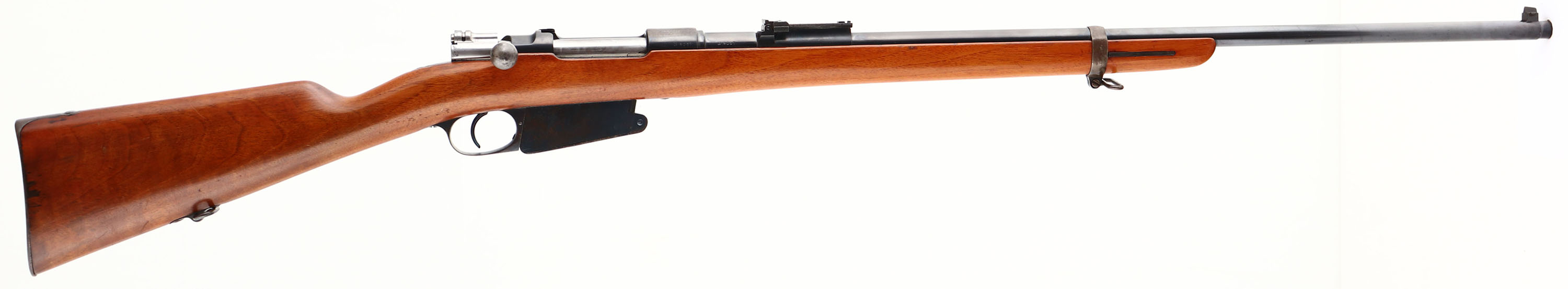Ludwig Loewe & Co., Model: 1891 Argentine Mauser, Cal: 7.65x53mm Mauser, MFG: 1892, S/N: B9057, Bolt action rifle, 29'' barrel. The straight wrist wood stock is very good as being cut down, shaped in spots, sanded & re-finished. The buttplate is proud to the wood at the toe. The cleaning rod hole has a wood plug fill. There are no visible cartouches on the stock. The blued metal finish on the barrel rates 90% with spotty brown patina forming in spots. The blued metal finish on the receiver rates 70% with gun metal gray & patina where the crest was ground off by the Argentine government, per the agreement of importing them. The other areas of the receiver retain deep, strong bluing. The left side of the receiver is stamped with two proof marks, ''MAUSER MODELO ARGENTINO 1891'', ''MANUFACTURA LOEWE BERLIN''. The right side of the receiver & barrel are stamped with the S/N. the top of the barrel has one proof stamp. All serialized parts are S/N matched to the rifle. The bore is excellent, its bright & mirror like with minimal wear. The barrel holds a barleycorn front sight with a flip up ladder, V-notch rear sight marked 4 to 20 on the ladder. The stock carries a blued steel buttplate. Buttplate has worn mostly gun metal gray with spots of patina. The rifle has both bottom sling mounts. Antique No FFL Req. - Value: 200 to 400