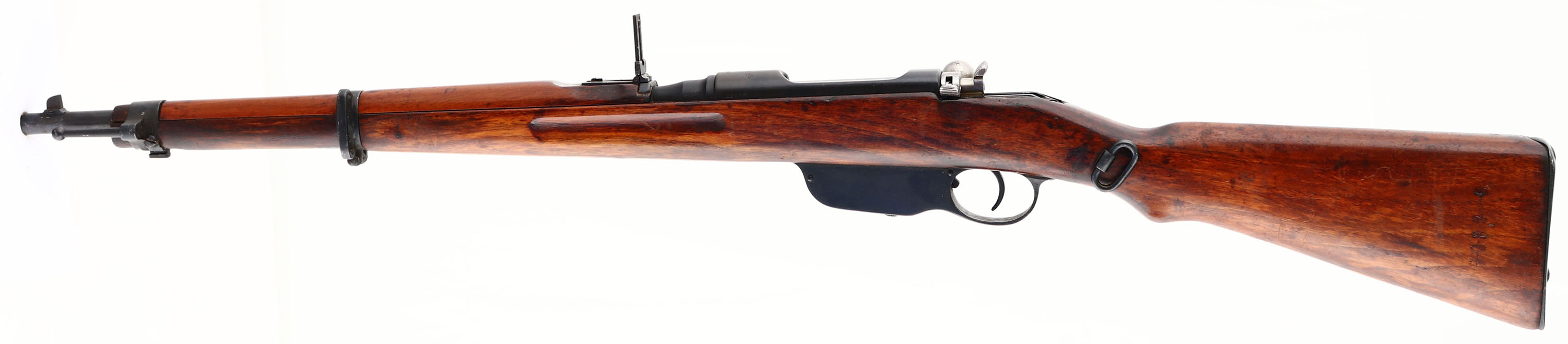 F.G.G.Y. Budapest (Hungarian), Model: M95/30 Repetier-Karabiner Stutzen, Cal: 8x56mmR, MFG: 1897-1918, S/N: 1948F, Straight pull bolt action rifle, 20'' barrel. The semi-pistol grip wood stock is excellent. This stock is a replacement from another rifle that was done when it was re-chambered in the 1930's. The original bottom rear sling swivel has been removed & the hole has a wood plug fill. on the left cheek there is the crossed out S/N of the previous rifle. The right cheek of the rifle has another crossed out number & the new S/N stamped into it. There is a ''0'' stamped into the top of the wrist. The rear of the comb is marked with a ''17'' in a box & a ''20'' in two boxes. The metal was re-blued when it was re-arsenaled & re-chambered in the 1930's, & as such rates 90% with full coverage, just has spots of wear & thinning. The receiver band is marked ''BUDAPEST'', ''M.95''. The left side of the receiver is marked with the S/N. the right side of the receiver is marked with a Prussian eagle proof stamp. All the marking on the receiver are faint from being buffed when it was re-blued. The left side of the barrel is marked with the S/N. the top of the barrel is marked with a ''S'' which means this rifle was re-chambered to 8x56mmR during the 1930's by OE.W.G. Styer, this mark would also be used as a military acceptance mark for the Austrian government in the 30's. the bottom end of the barrel is marked with import stamps. The bore is excellent. The barrel holds a tall barleycorn front sight, with a flip up ladder, V-notch rear sight marked 6 to 24. the stock carries a blued steel buttplate. Rifle has both side sling mounts. A very nice example of a M95/30 straight pull rifle that was originally a carbine, not a ling rifle that was cut down. FFL or C&R Req. - Value: 300 to 600