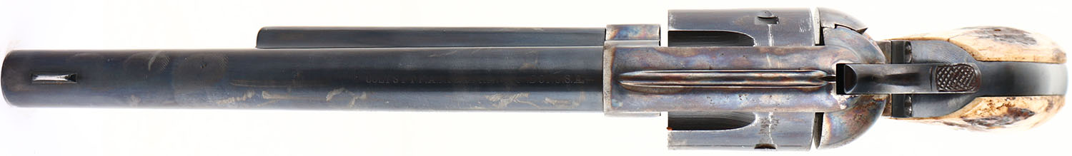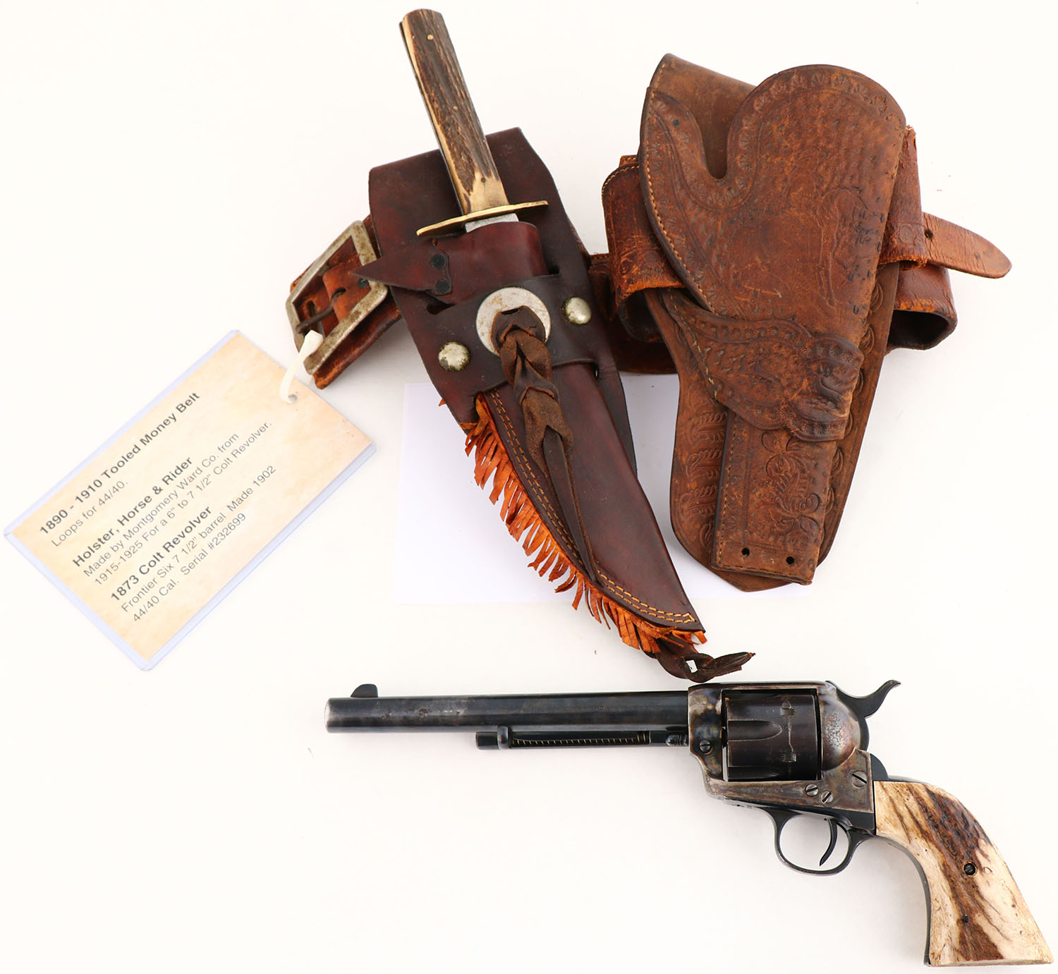 UNIQUE SET, Colt, 1873 Frontier Six Shooter, CAL: 44-40 WCF, MFG: 1902, SN: 232699, Single Action Revolver, 7 1/2'' barrel. The top of the barrel is marked ''COLT'S PT F.A MFG CO HARTFORD CT. U.S.A.''. The left side of the barrel is marked ''COLT FRONTIER SIX SHOOTER''. The left side of the frame is marked with the standard Colt patent dates. All matching SN on the frame, trigger guard & butt. This revolver was refinished at one time. The Stag horn grips are excellent, with nice figure & color. The reblued metal finish on the barrel rates 60%, with areas of thinning toned to a brown patina. The case-hardened frame retains faded, but visible case-colors. The trigger guard rates 95% & the cylinder rates 80%. There is intermittent rust spotting throughout the metal surfaces. Bore is good, with consistent roughness & light pitting. Integral small notch rear sight & blade front sight. This pistol is accompanied by a Tooled Money Belt circa 1890-1910 with loops for 44-40 (marked 44-40). The belt carries a Montgomery & Ward Co. ''Horse & Rider'' holster made circa 1915-25 & a well-made custom vintage knife sheath that holds an Edge Brand - Original Bowie Knife with Stag horn grips, made in Solingen Germany. A very unique & well compiled set. FFL or C&R Req. - Value: 3000 to 5000