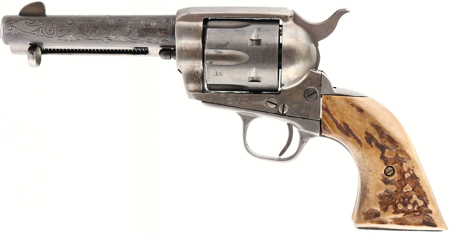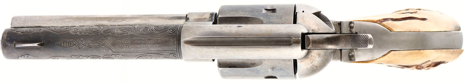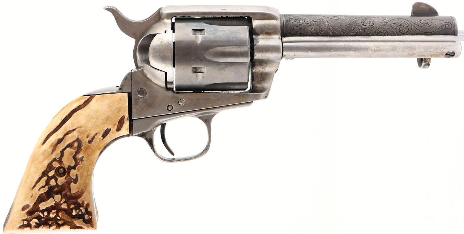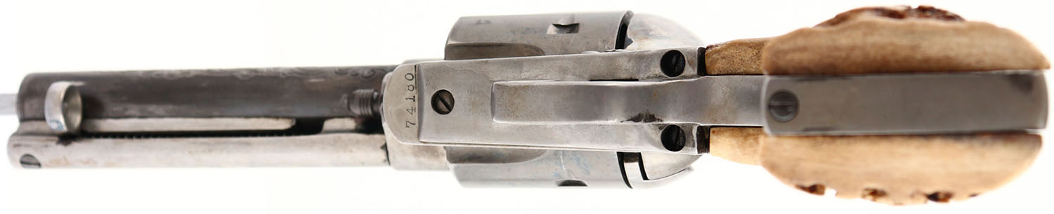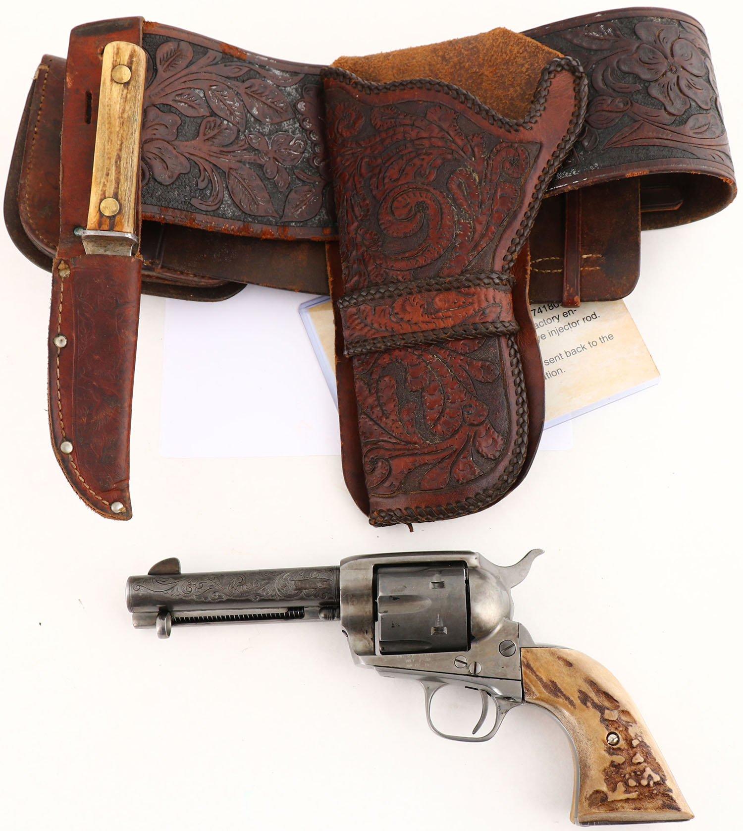 UNIQUE SET, Colt, 1873 Single Action Army, MFG: 1882, SN: 74180, Single Action Revolver, 4 5/8'' barrel. The top of the barrel is marked in two lines ''COLTS PT. F.A MFG CO HARTFORD CT U.S.A''. The left side of the barrel is marked ''.45 COLT. The left side of the frame is marked with standard patent dates that have been partially buffed smooth. The SN can be found on the bottom of the frame & under the grips. The Stag grips are excellent. The metal finish has been stripped leaving the gun ''in the white''. The case-hardened frame has thin shadows from case-colors. The barrel was nicely engraved with floral scroll & punch-dot pattern. Bore is excellent, with minor roughness amongst the land & groove creases. Integral square notch rear sight & blade front sight. Bulls-eye ejector rod. This pistol is accompanied by a Otto Ernst Marked Tooled Belt & Ammo pouch made circa early 1900's -30's. The belt & holster & are all intricately tooled with floral leaf & the knife sheath displays deer & bird vignettes. The knife sheath carries a unmarked blade, with bone/antler grips. Another complete & unique set. Antique, No FFL Req. - Value: 1000 to 3000