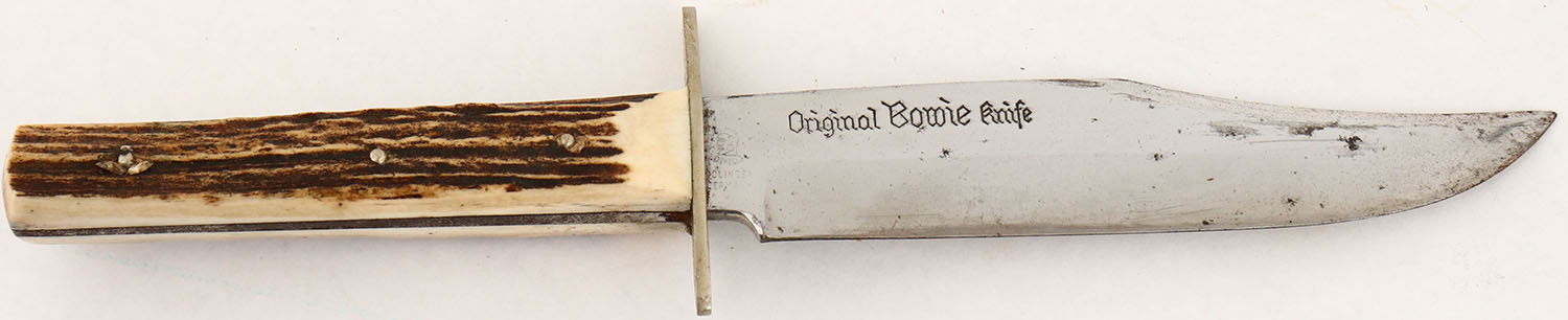 UNIQUE SET, Colt, 1873 Single Action Army, CAL: 45 COLT, MFG: 1899, SN: 182116, Single Action Revolver, 5 1/2'' barrel. The top of the barrel is marked ''COLT'S PT F.A MFG CO HARTFORD CT. U.S.A.''. The left side of the barrel is marked ''COLT SINGLE ACTION ARMY .45''. The left side of the frame have the standard patent dates & the circled Rampant Colt logo, with the left side of the circle worn thin. All matching SN on the frame, trigger guard & butt. The Stag grips with carved eagle & high gloss finish are excellent. The metal blue finish on the barrel rates 85%, with visible thin brush lines & concentrated loss on the ejector rod housing & muzzle from holster wear. The cylinder rates 80%, with visible thin brush lines & concentrated wear to the front edges from holster wear. The case-hardened frame has worn to metal gray & toned to a brown patina. The trigger guard has also worn to metal gray & toned to a brown patina, with blue remaining in protected areas. Bore is excellent. Integral v-notch rear sight & dorsal fin blade front sight. This gun is accompanied by an Indian Beaded Belt circa 1890's, it is 4'' wide, with white body, red border & four roses, all made up of red, white & green seed beads. Star Conchos border each end of the beads. The belt carries a holster marked ''R.K. MAUK MAKER PUEBLO COLO.'' & an unmarked knife sheath that holds a Original Bowie knife with stag grips, by Anton Wingen Jr., Solingen Germany, stamped ''OTHELLO''. The blade has intermittent spotting. Another unique set that presents wonderfully. Antique, No FFL Req. - Value: 1500 to 3500