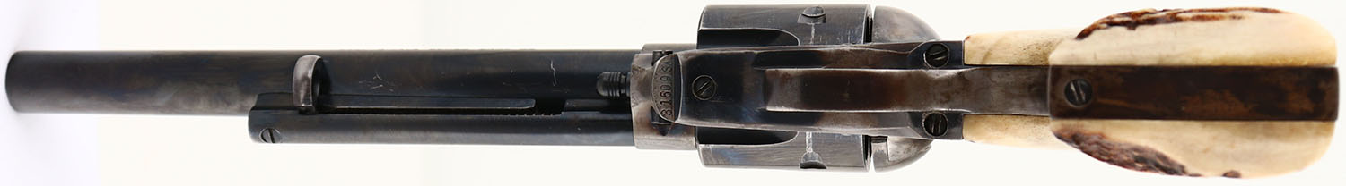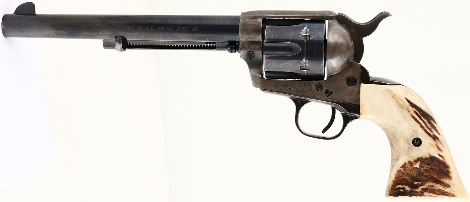 Colt, Single Action Army - Early 2nd Gen, CAL: 45, MFG: 1960, SN: 31509SA, Single Action Revolver, 7 1/2'' barrel. The authentic Stag grips are excellent. The metal blue finish on the barrel rates 97%, cylinder 85% & the trigger guard has worn to a mix of remaining blue, metal gray & brown patina. The case-hardened frame has worn to metal gray & a thin brown patina, with case-colors remaining in heavily protected areas. Bore is excellent. Integral square notch rear sight & dorsal fin front sight. FFL or C&R Req. - Value: 900 to 1500