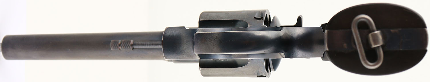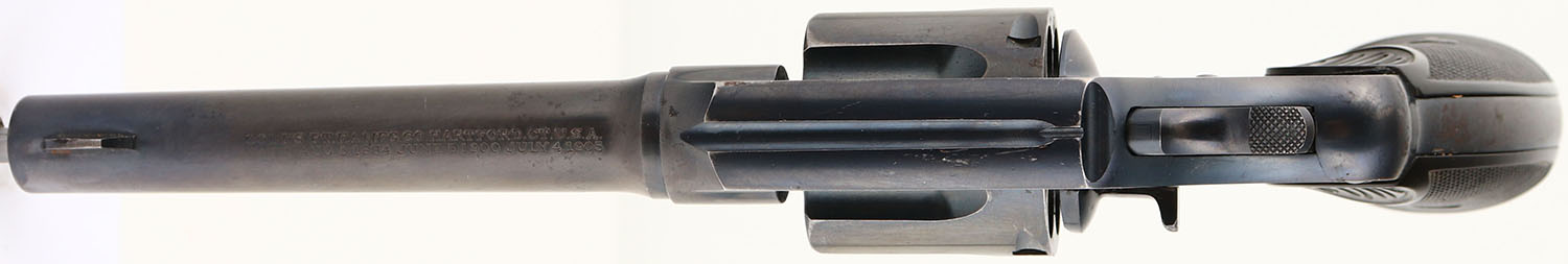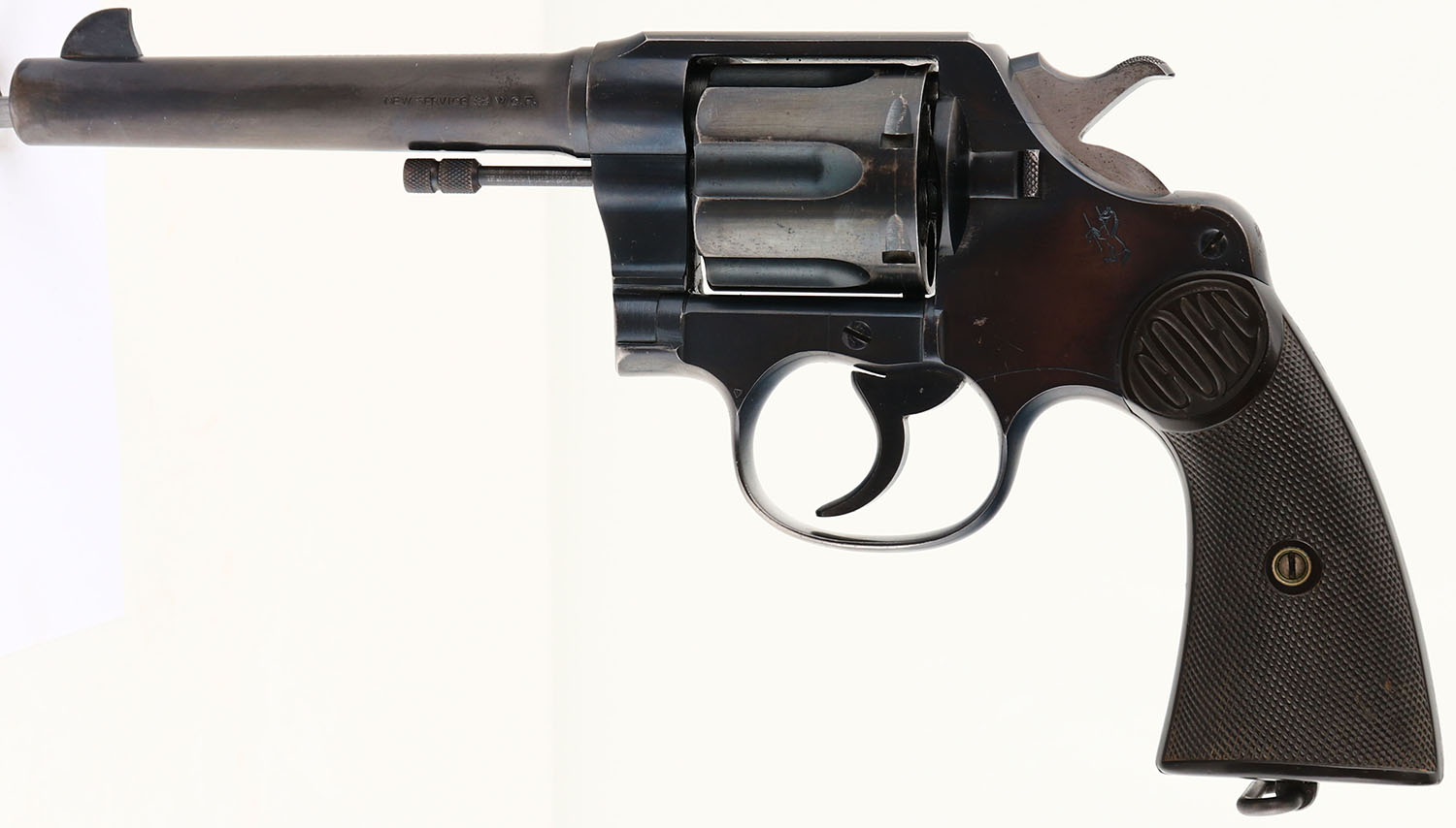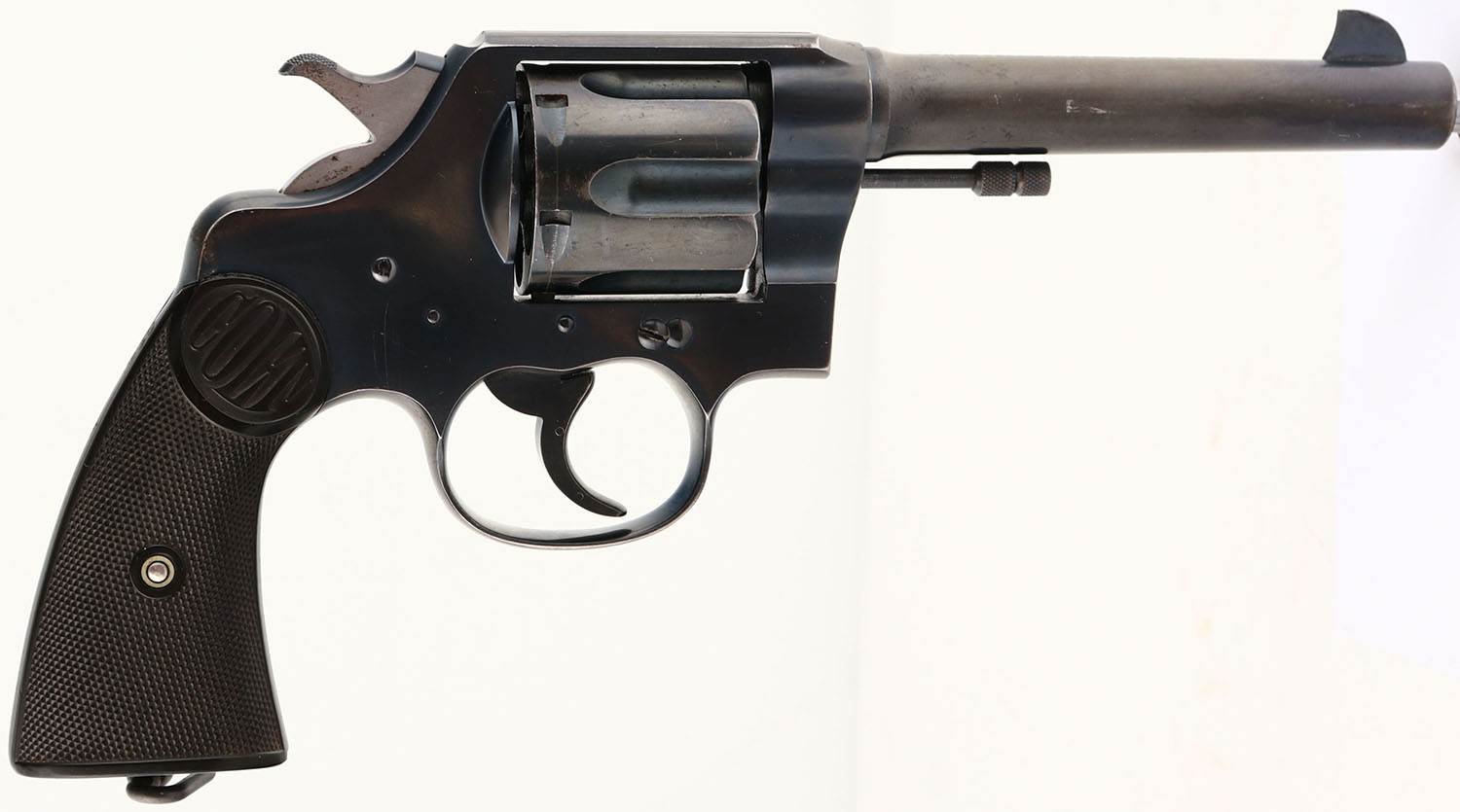 Colt, New Service Model 1909 Transition, CAL: 38 WCF (38-40), MFG: 1922, SN: 316955, Double Action Revolver, 5 1/2'' barrel. During the transition from the ''OLD MODEL'' to ''NEW MODEL'', a steel block was installed between the hammer and firing pin. The steel block would lower when the pistol is cocked, when not cocked the steel block is in the up position to block the hammer from striking the firing pin if dropped. Old Model serial numbers 0-21000. Mfg. 1898-1909. New Model's added the ''positive lock'', serial numbers 21000-348000. Mfg. 1909-1943, which this example falls under. The Colt checkered hard rubber grips are excellent. The metal blue finish on the barrel rates 90%, with holster wear at the muzzle, 95% on the frame, 85% on the trigger guard, with concentrated wear to the backstrap & 90% on the cylinder, with holster wear. Bore is excellent. Integral notch rear sight & dorsal fin blade front sight. Lanyard loop. A nice example of a 1909 Transition Model. FFL or C&R Req. - Value: 1000 to 1600