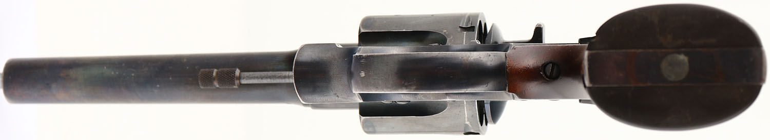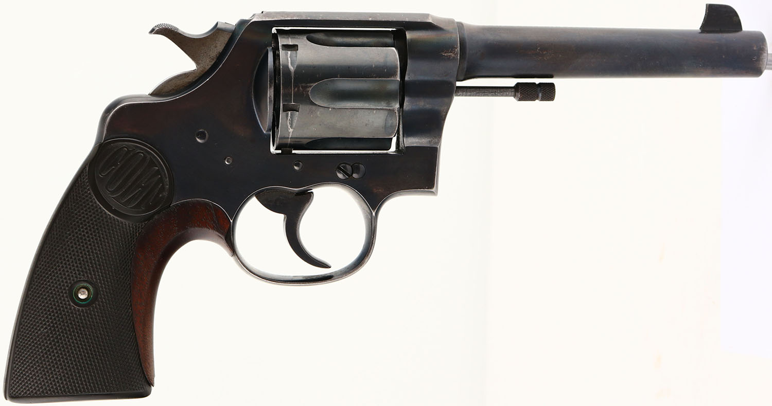 Colt, New Service Model 1909 Transition, CAL: 45 COLT, MFG: 1924, SN: 320091, Double Action Revolver, 5 1/2'' barrel. The Colt checkered hard rubber grips are excellent. The bottom front corner of the left grip does have a small edge chip, otherwise excellent. Added wood grip insert, with an edge chip. The revolver appears to have been refinished at one time. The address & patent dates appear thin from being buffed. The barrel rates 70%, with areas worn to metal gray, toned to brown patina & a discolored heat exposure spot between the address stamp & front sight. The metal blue finish on the frame rates 85%, with concentrated loss on the top strap, along with similar heat exposure discolorations on both sides of the top strap. The cylinder rates 70%, with scratches, spotting & areas worn to metal gray, toned to a brown patina. The metal blue finish on the trigger guard rates 60%, with concentrated loss on the front & back strap. Lanyard loop has been removed & stud was smoothed. Bore is excellent, with intermittent speckling & light wear marks. Integral notch rear sight & dorsal fin blade front sight. FFL or C&R Req. - Value: 400 to 800